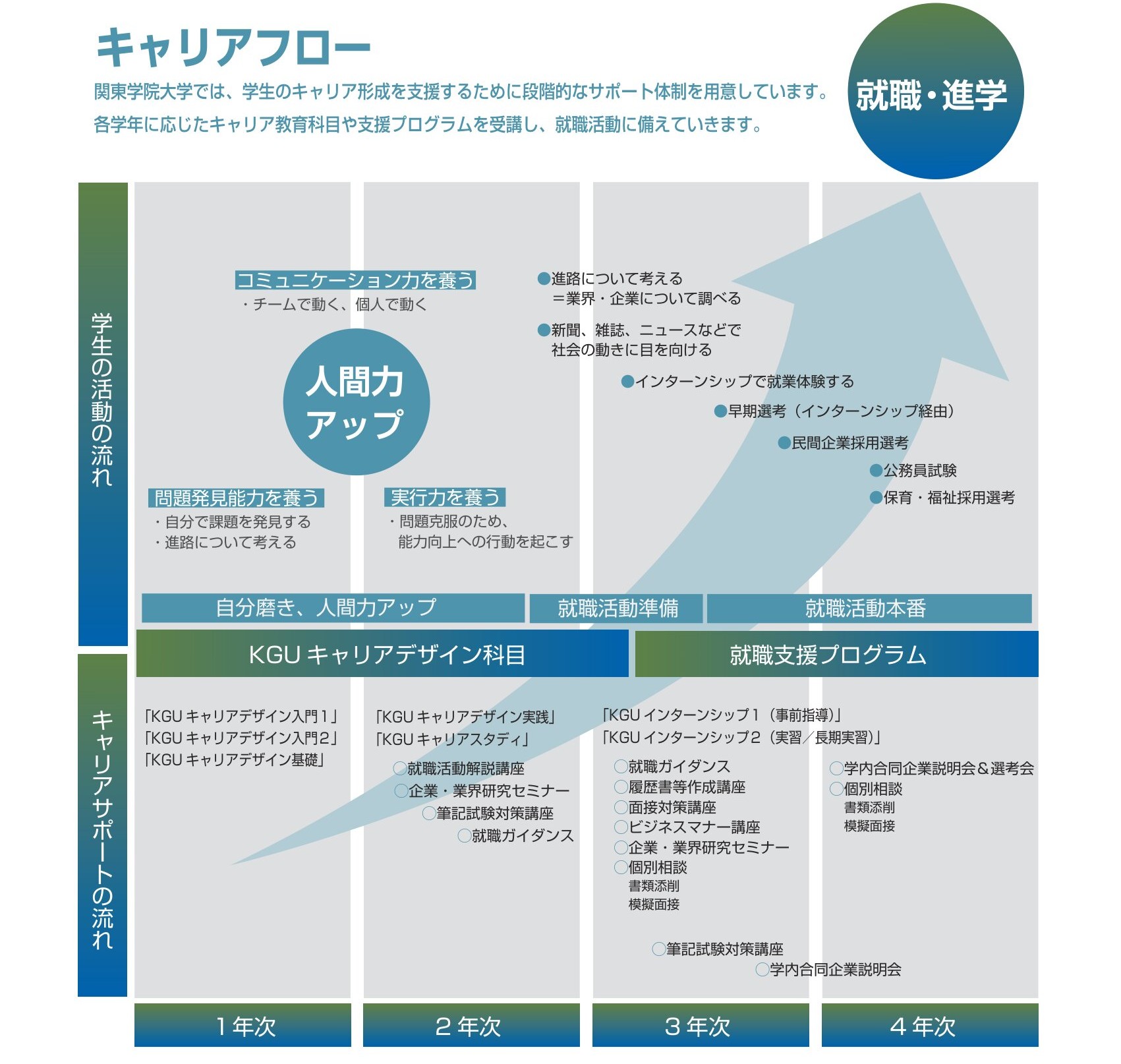 関東学院大学では全学共通のキャリア教育科目として、「KGUキャリアデザイン入門1」・「KGUキャリアデザイン入門2」・「【マイナビ寄付講座】KGUキャリアスタディ」・「KGUキャリアデザイン基礎」・「KGUキャリアデザイン実践」・「 KGUインターンシップ1(事前指導)」・「KGUインターンシップ2(実習)」・「KGUインターンシップ2(長期実習)」の8科目を設けています。