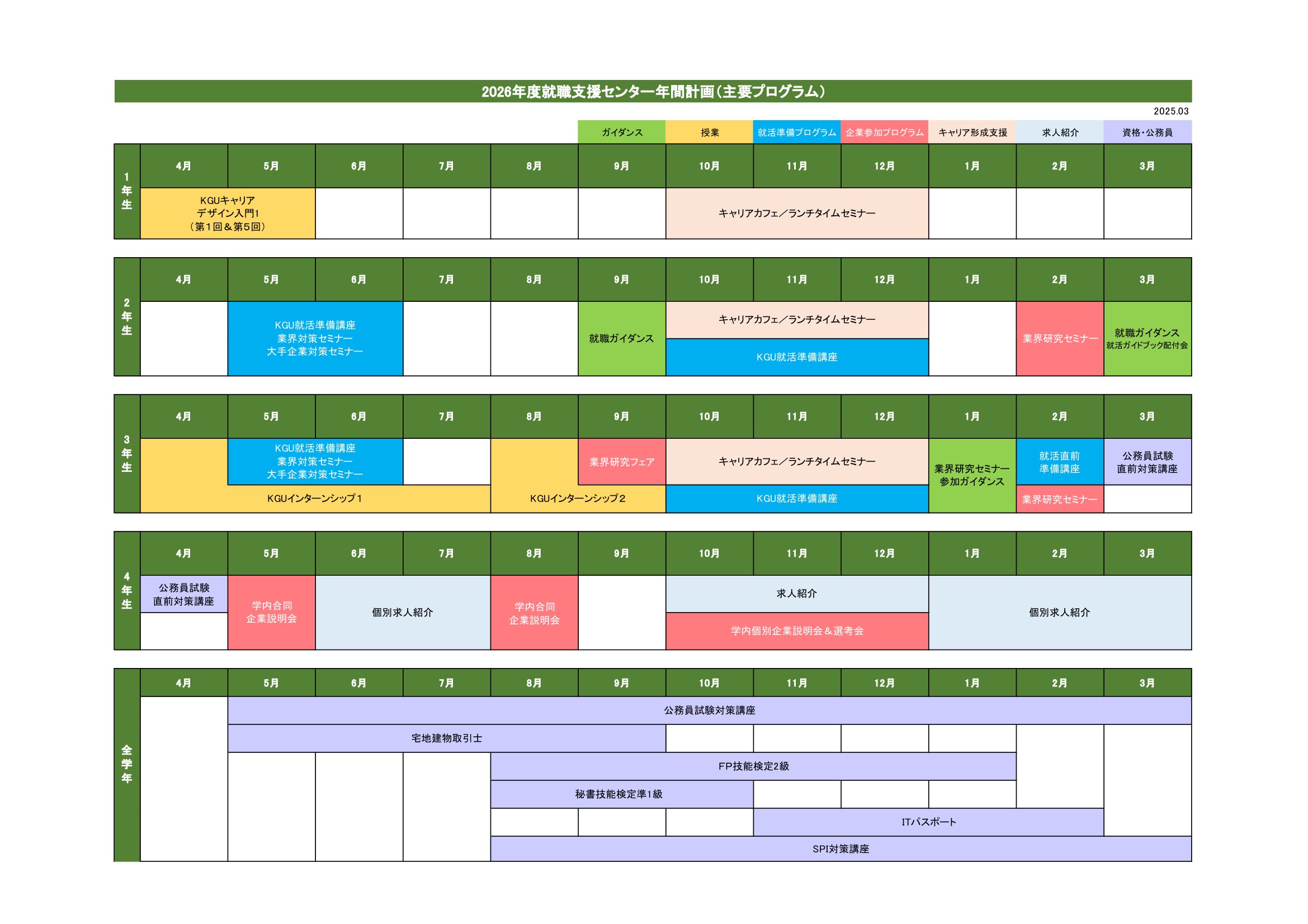 就職活動の環境に合わせてそれぞれの年次で対策を行えるよう、各種の講座・セミナー・イベントを告知しています。
