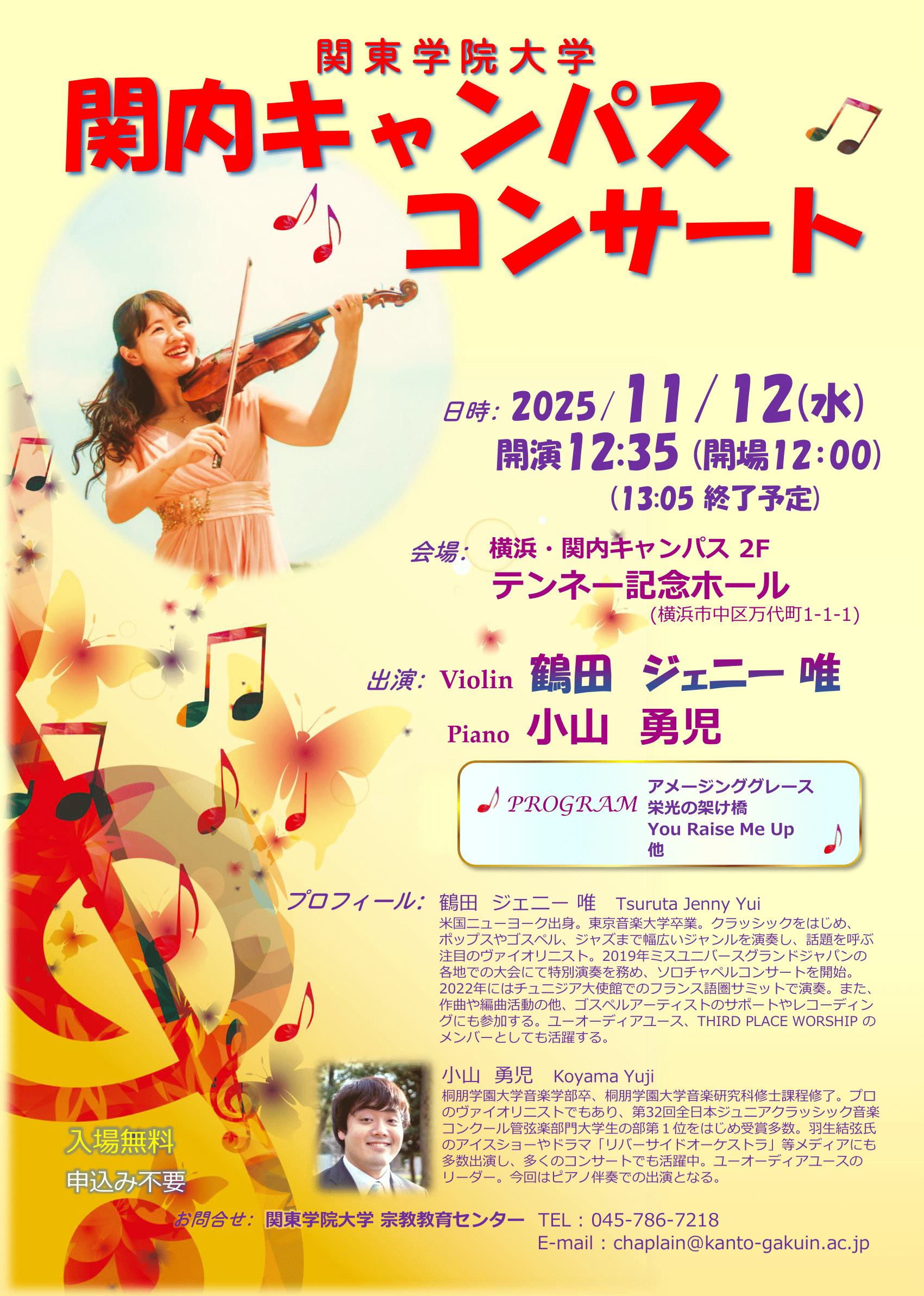 大学宗教教育センターでは、毎年2回、横浜・関内キャンパス テンネー記念ホールにて、クリスチャンアーティストをお迎えし、「関内キャンパスコンサート」を開催しています。