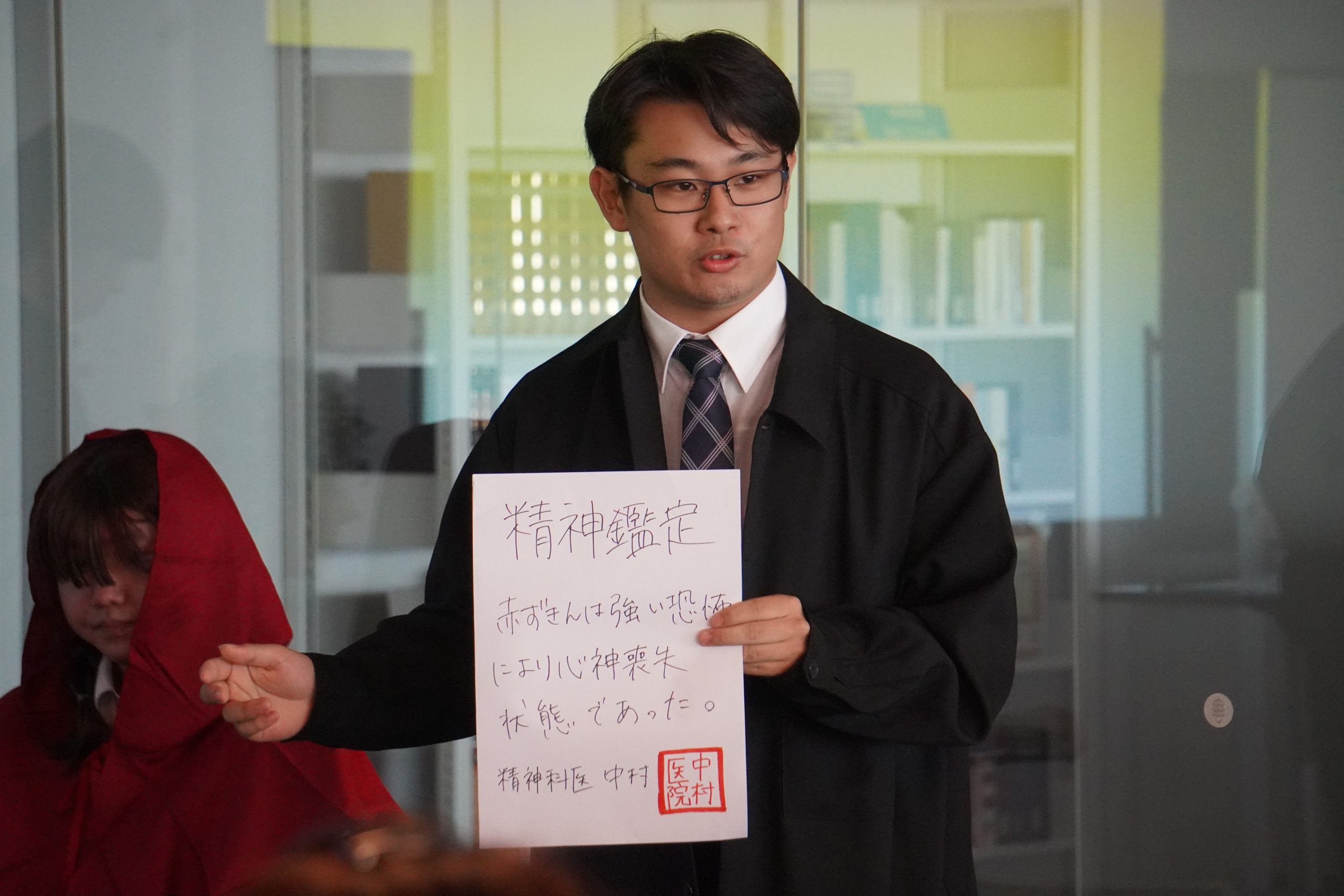 特に賑わいを見せたのは「法学部生による赤ずきん模擬裁判!」。童話『赤ずきん』を題材に、オオカミのお腹に石を詰めて懲らしめた赤ずきんちゃんを被告人とした模擬裁判を学生が実演。参加者は裁判員として”赤ずきんちゃんを殺人罪に問えるのか”を考える企画です。参加者からは、「身近な童話が題材だったので、専門的な法律用語も理解しやすかった」といった声が寄せられました。