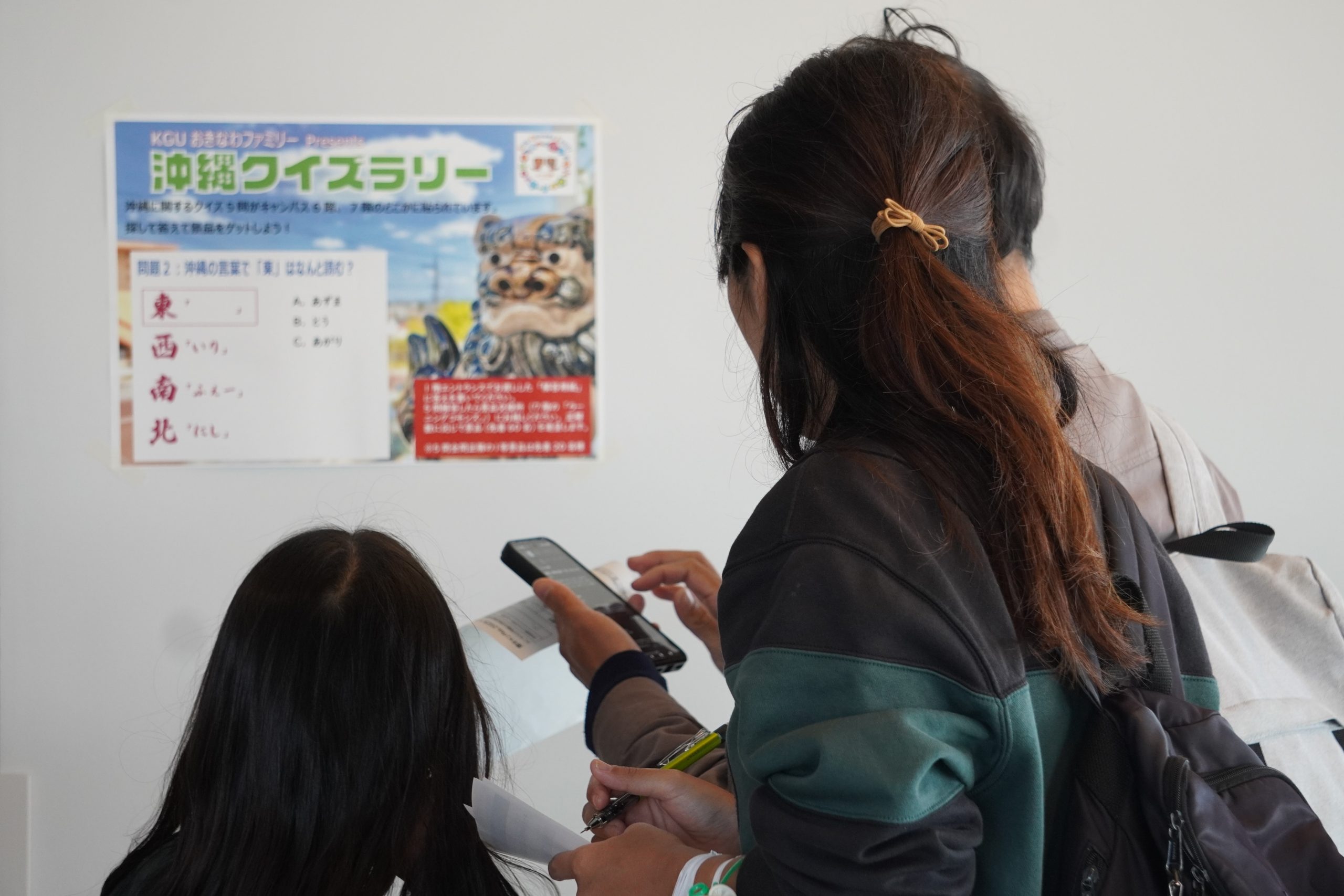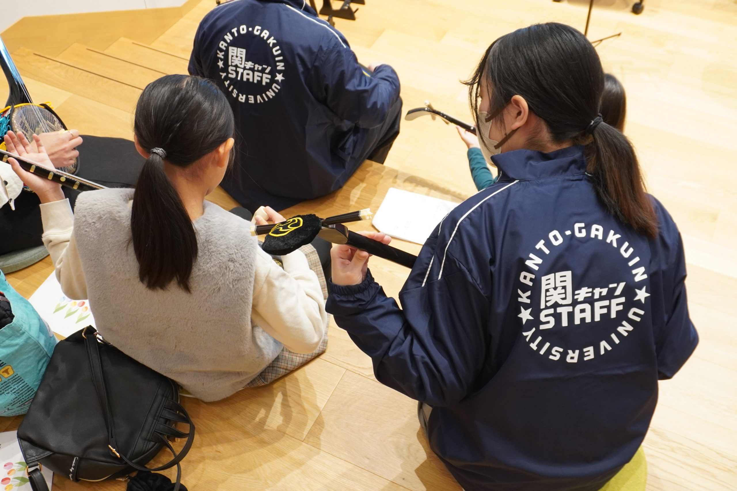 会場では、学生たちが学部での学びや企業・自治体と連携した社会貢献活動を紹介するブースを出展したほか、各学部教員による研究テーマや教育内容を体験できる模擬授業も実施しました。さらに本学と連携協定を結ぶ沖縄にちなんだ体験企画として、三線教室やシーサー色塗り、沖縄クイズラリーなどを開催。各ブースの運営は、同キャンパスを修学キャンパスとする経営学部・法学部・人間共生学部コミュニケーション学科の学生団体「関キャンスタッフ」が担いました。