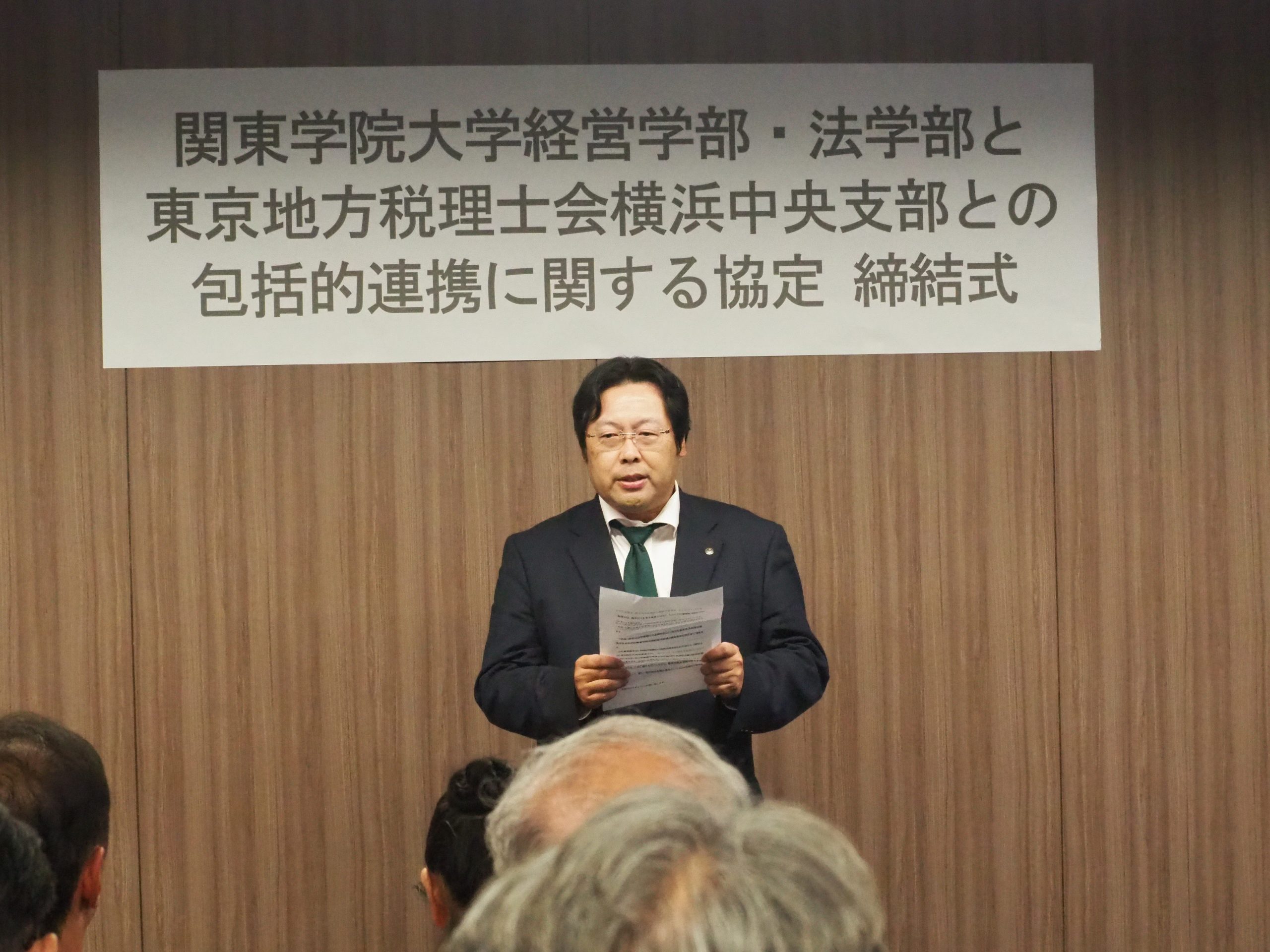 続いて、東京地方税理士会横浜中央支部の甲田勝人支部長は、10月に本学で開催したシンポジウムを振り返り、「税理士は数字だけを見る仕事ではなく、人と人の信頼をつなぐ職業である。その姿を学生の皆さんに実感してもらえたことを嬉しく思う」と述べました。また、本協定は一方的に知識を伝えるものではなく、「学び合い、育ち合うための約束である」と強調しました。