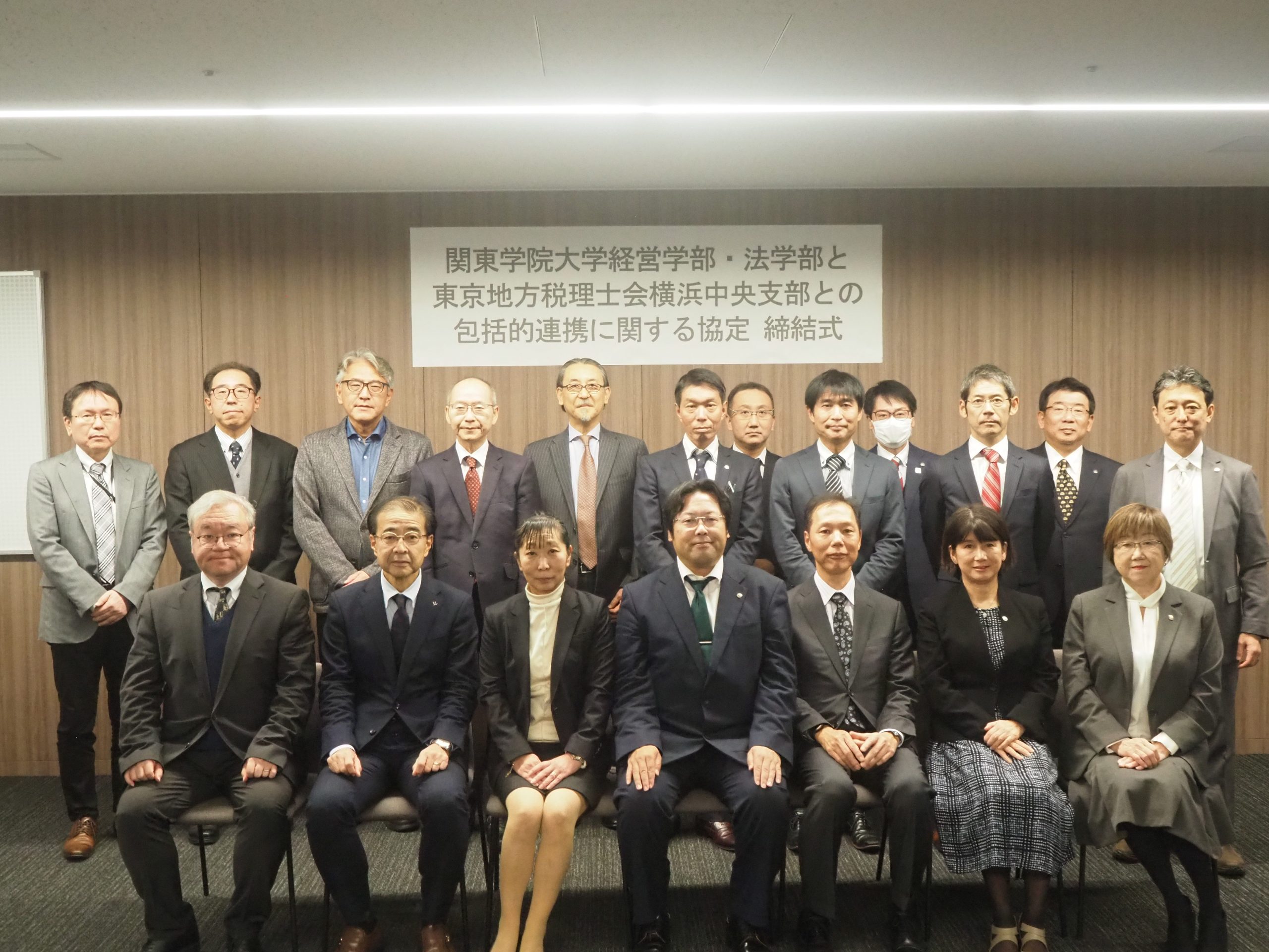 関東学院大学経営学部・法学部は東京地方税理士会横浜中央支部との包括的連携協定を締結し、11月12日には締結式が横浜・関内キャンパスで執り行われました。本協定は、昨年度に法学部が締結した連携協定を基盤とし、今年度より経営学部も新たに加わることで、教育・研究・地域貢献における取り組みをさらに発展させることを目的としています。