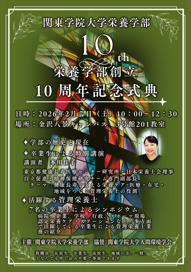 | プログラム | ○学部の歴史と現在 ○卒業生による特別講演 講演者:本川佳子 東京都健康長寿医療センター研究所・日本栄養士会理事 自立促進と精神保健研究チーム専門副部長 テーマ:健康長寿を支える栄養ケア 医療・在宅・地域をつなぐ管理栄養士の役割 ○活躍する管理栄養士 7名の卒業生によるシンポジウム |