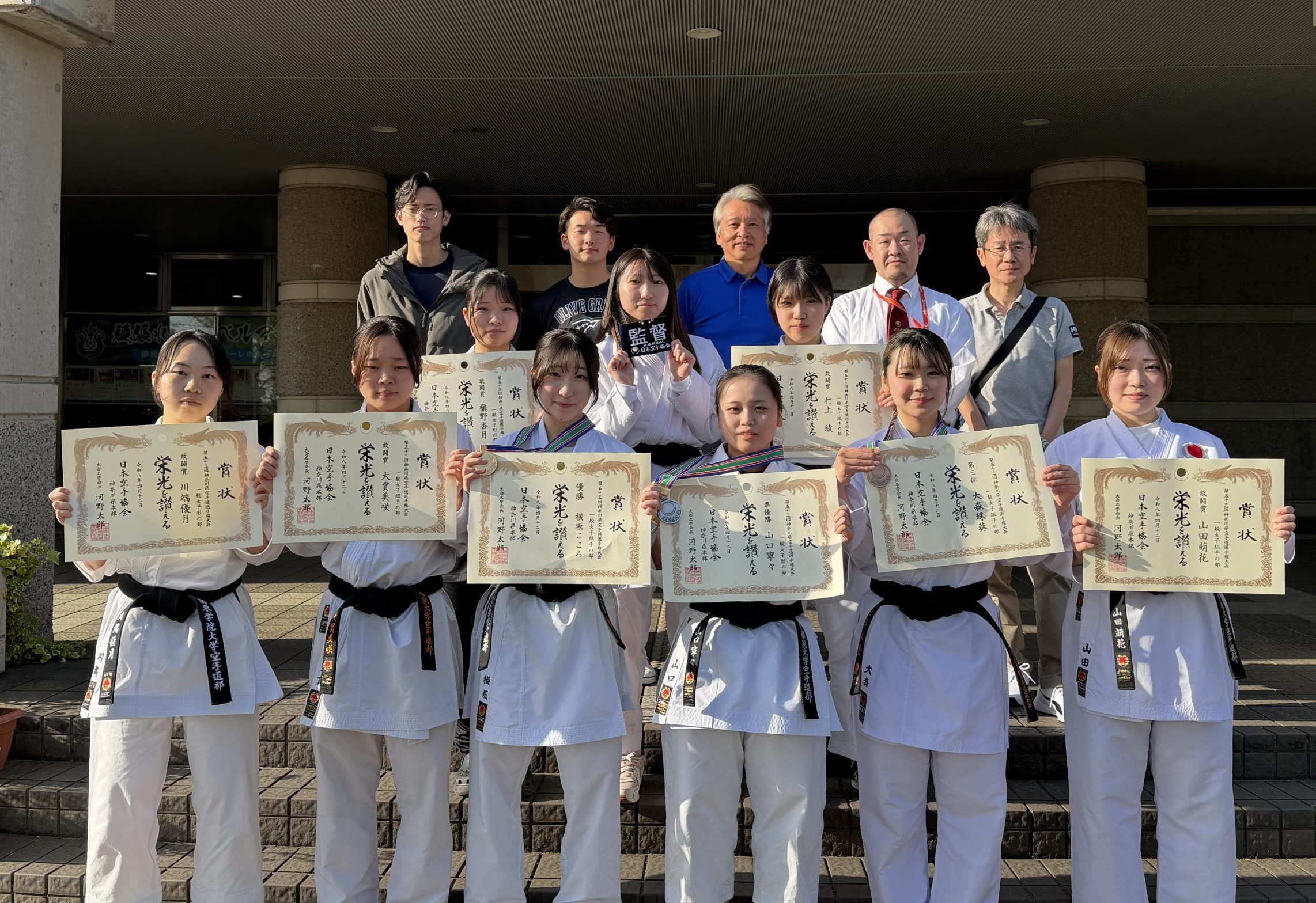 4月12日、伊勢原市総合体育館(神奈川県)にて開催された第53回神奈川県空手道選手権大会にて、女子部員8名が参加し、選手全員が表彰・入賞を果たし全国大会への出場権を獲得しました。