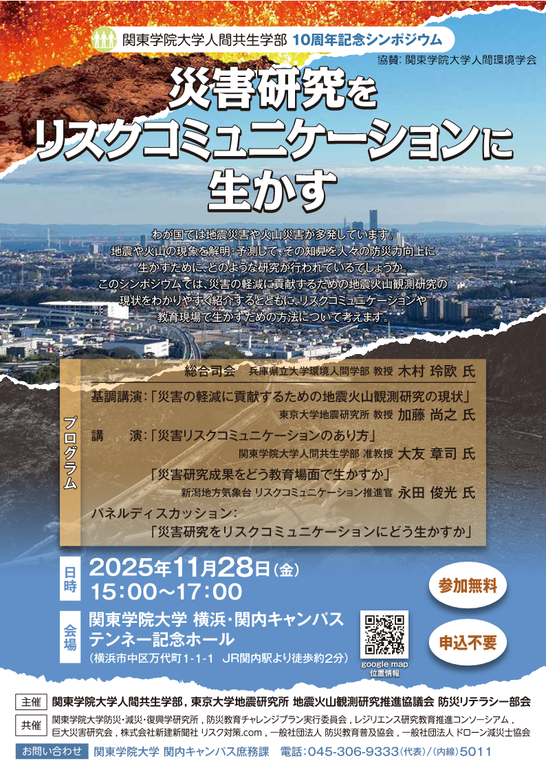 主催 ・関東学院大学 人間共生学部 ・東京大学地震研究所 地震火山観測研究推進協議会 防災リテラシー部会