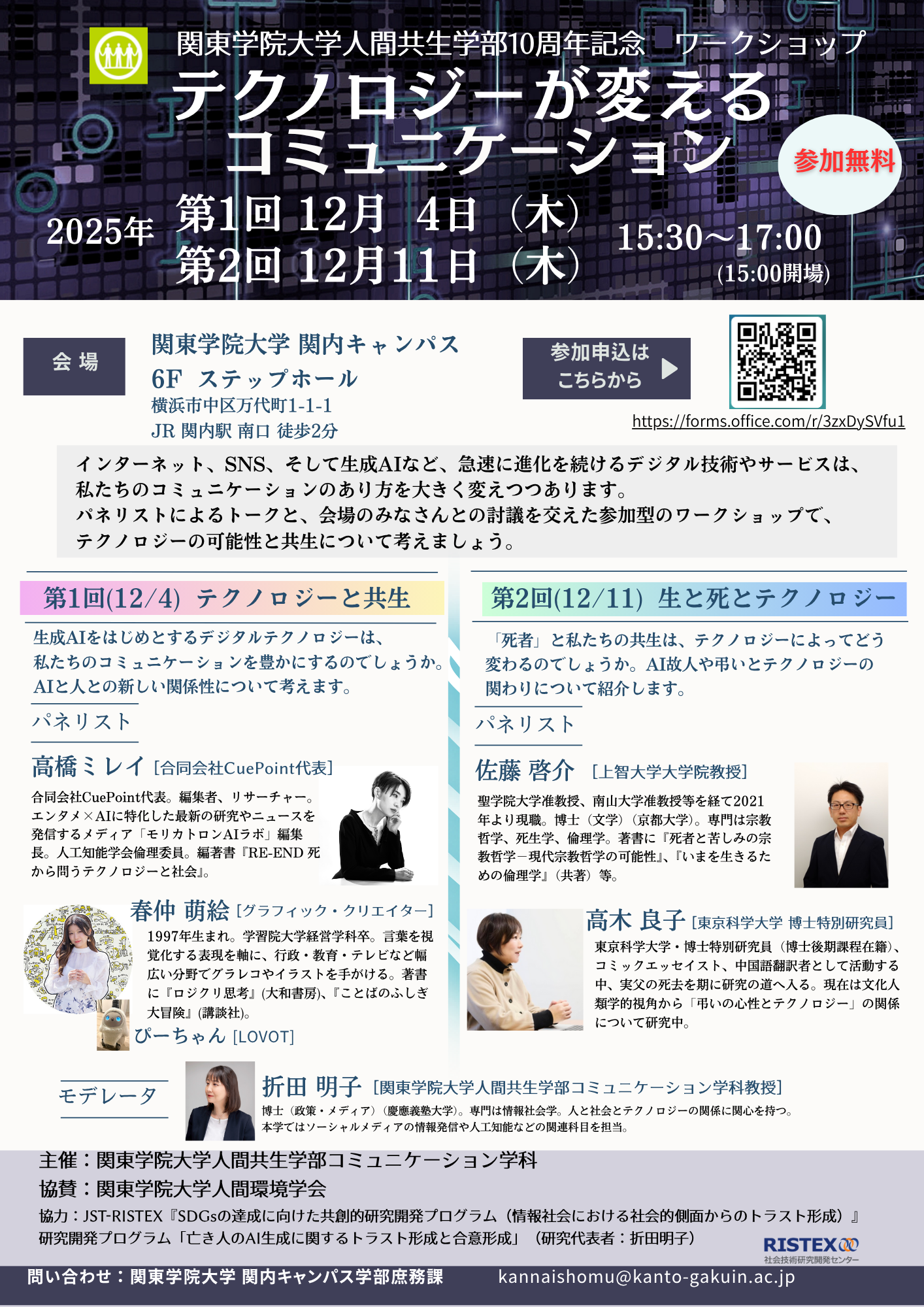 日時 2025年12月4日(木)15:30~17:00(15:00開場) 会場 関東学院大学 横浜・関内キャンパス 6階 ステップホール パネリスト ・高橋 ミレイ氏(合同会社CuePoint代表)