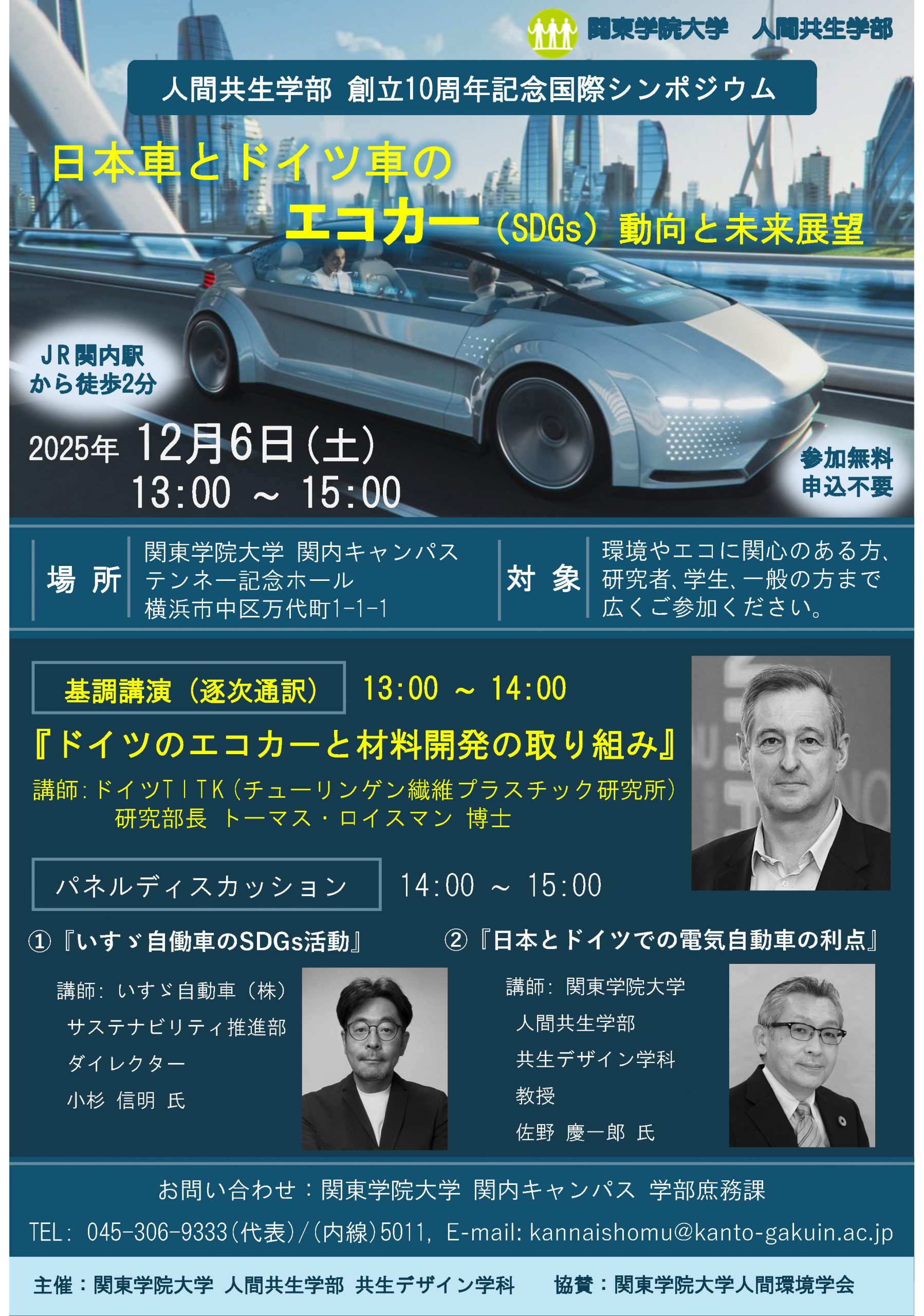 12月6日(土)、横浜・関内キャンパスにて人間共生学部10周年記念国際シンポジウム「日本車とドイツ車のエコカー(SDGs) 動向と末来展望」を開催します。
