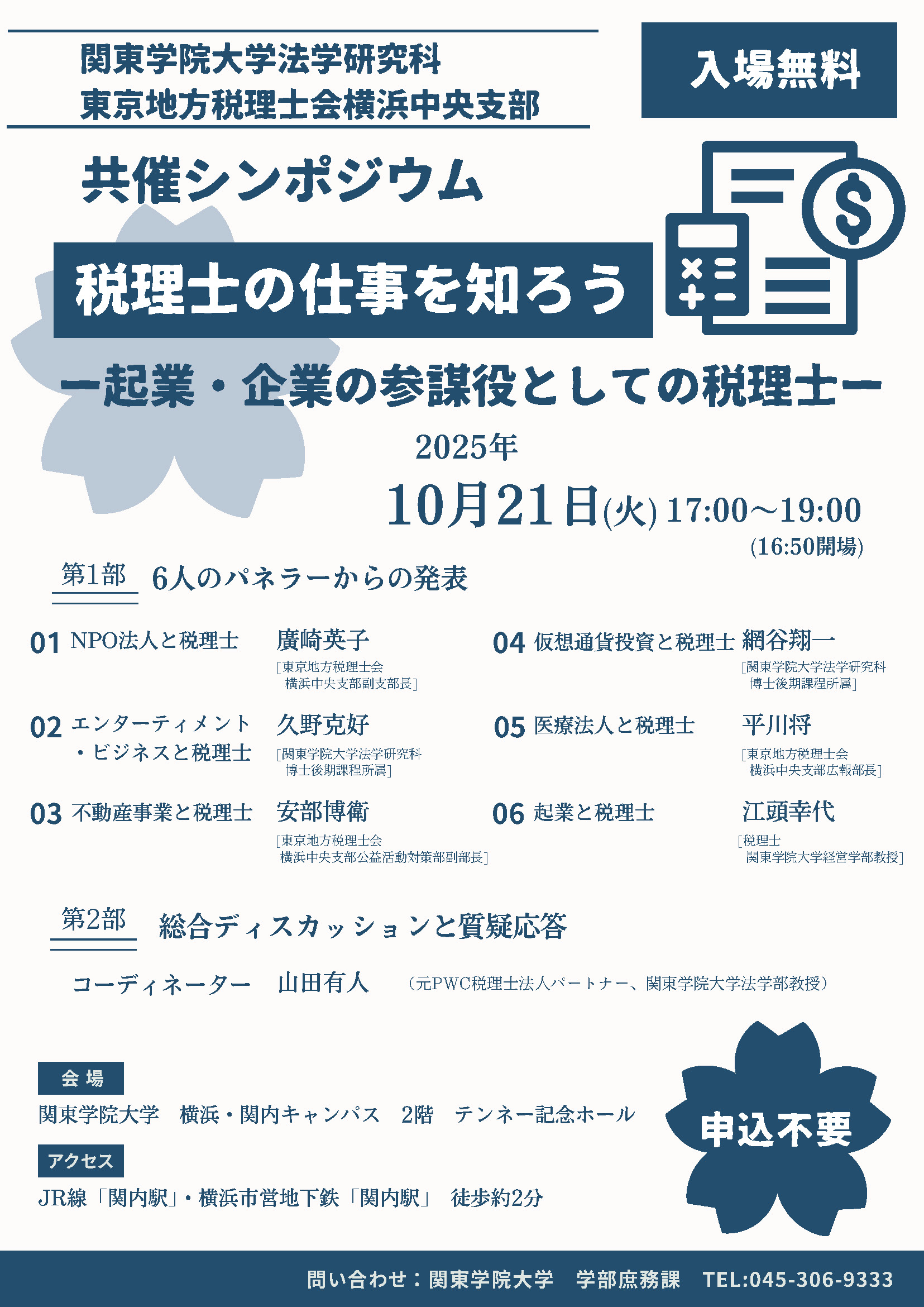 10月21日(火)、横浜・関内キャンパスにて関東学院大学法学研究科と東京地方税理士会横浜中央支部との共催シンポジウム「税理士の仕事を知ろう―起業・企業の参謀役としての税理士―」を開催します。