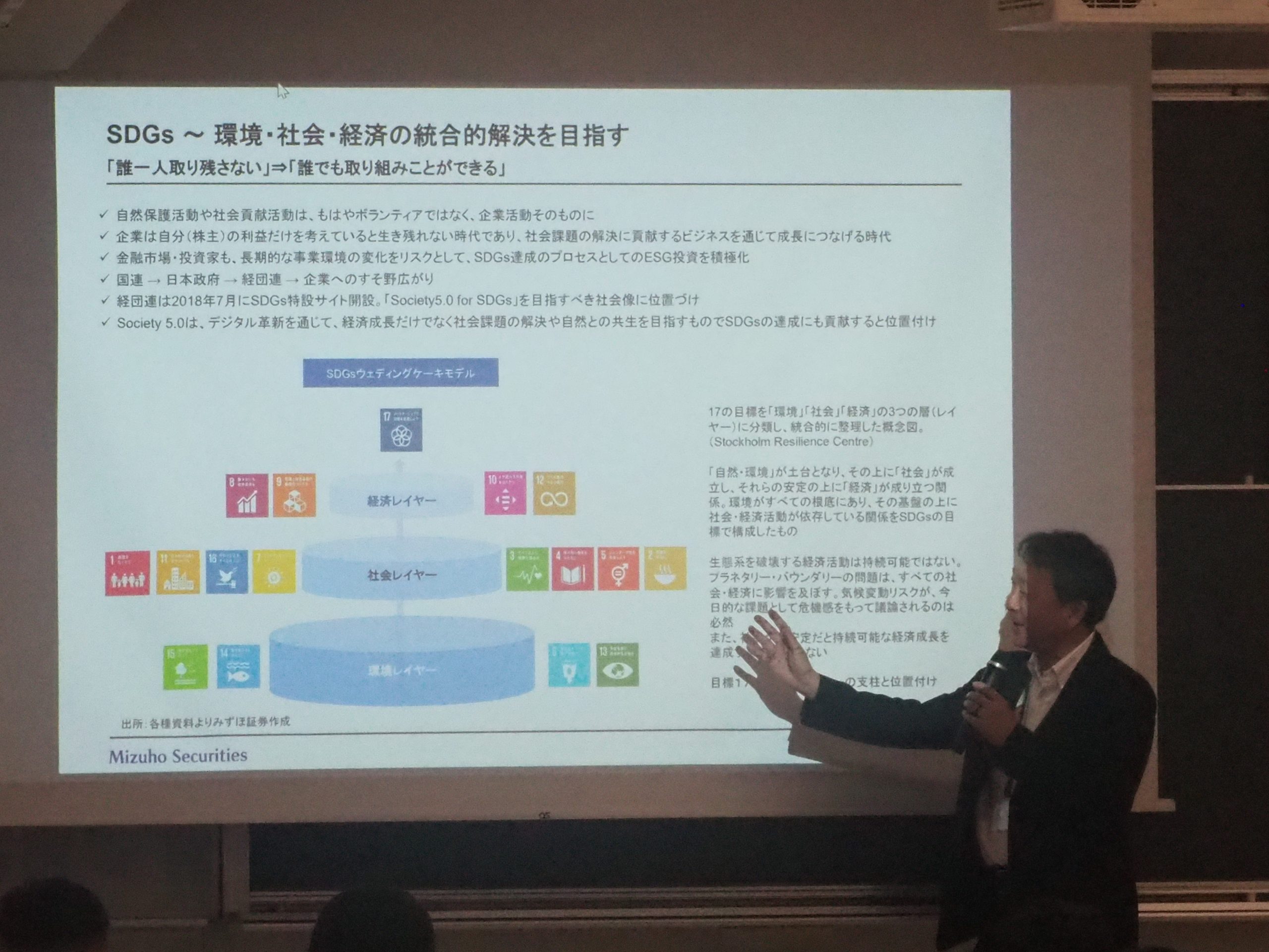 まず、みずほ証券株式会社の香月康伸氏が「サステナブルファイナンス概論」と題して講義を行いました。香月氏は、持続可能な社会の実現に向けて金融が果たす役割について説明し、「サステナブルファイナンスとは、環境・社会・ガバナンス(ESG)の観点から、社会課題の解決に資金の流れを結びつける仕組みです」と語りました。