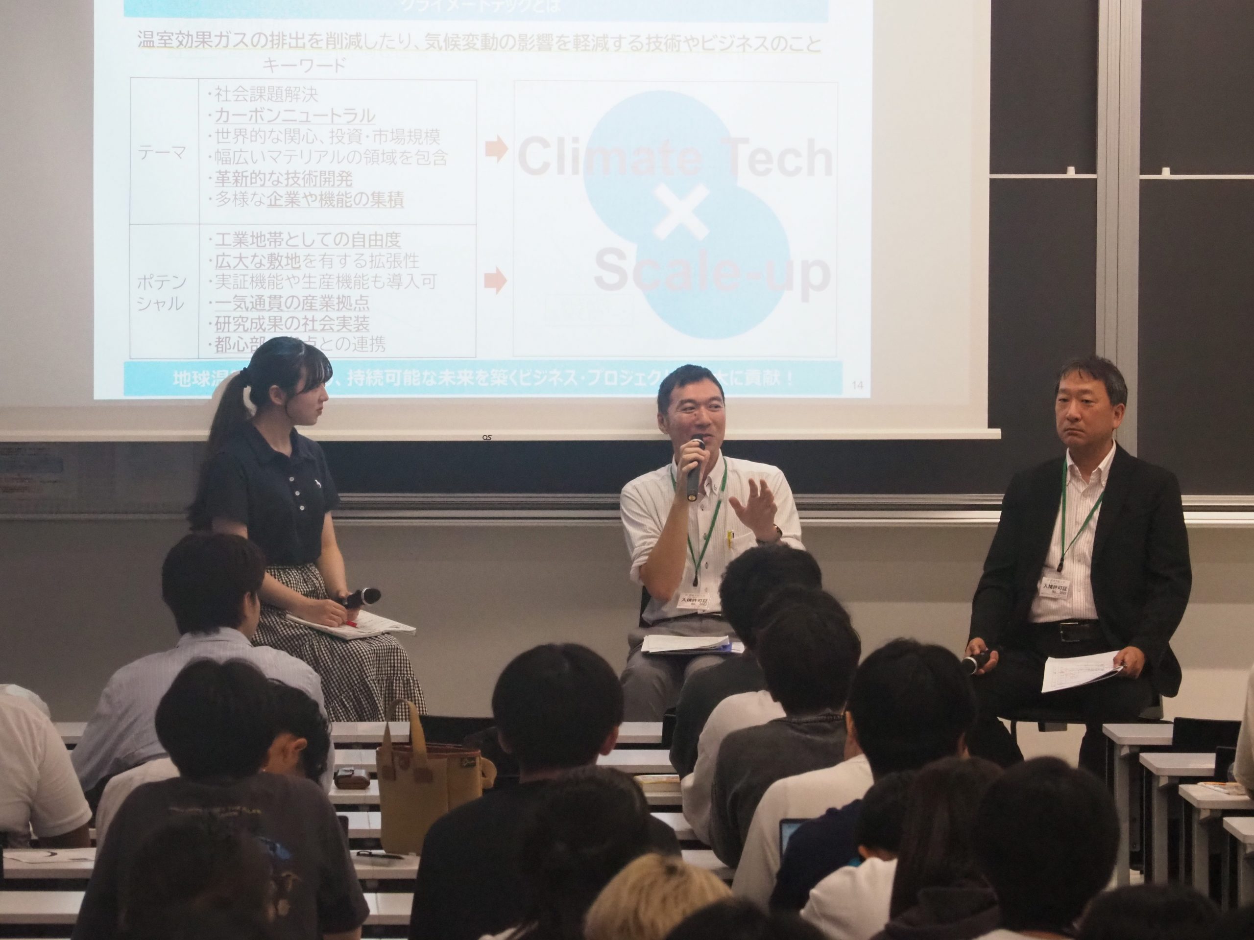 講義の最後には、香月氏と佐藤氏、本学学生を交えてパネルディスカッションを実施。学生から「ESG債を発行する際に苦労した点はありますか」と質問があり、川崎市の佐藤氏は「投資家に市の取組を理解してもらうための情報発信や、新しい投資家層との信頼関係づくりに苦労しました」と回答しました。みずほ証券株式会社の香月氏は「証券会社の立場からすると苦労ではなくチャレンジです。グリーンボンド市場はまだ新しく、試行錯誤を重ねながら仕組みを作り上げてきました」と話しました。