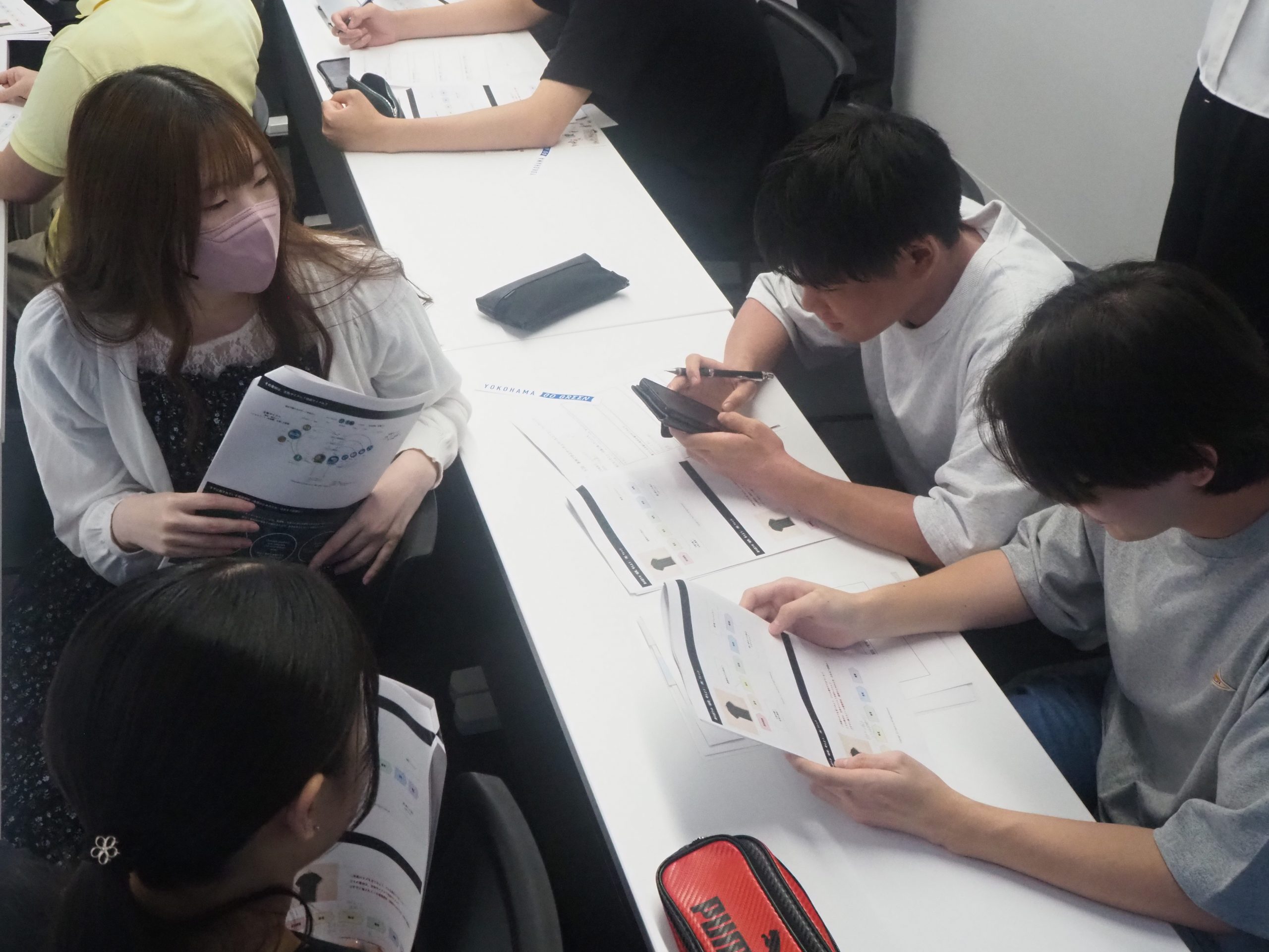プロジェクト始動に向け、9月30日には横浜市役所 脱炭素・GREEN EXPO推進局脱炭素社会移行推進部脱炭素ライフスタイル推進課の飯島氏、堺氏より、脱炭素社会の形成に向けた横浜市の取組みの紹介がありました。特に、脱炭素ライフスタイル推進課では、脱炭素化に向けた「市民の行動変容」を促す事業を展開しており、「YOKOHAMA GO GREEN」を合言葉とした環境にやさしい10の行動「GO GREEN 10 Action」の呼びかけ等を行っています。また、横浜市と協働し事業に取り組んでいるハーチ株式会社の丸山氏、室井氏がサーキュラーエコノミーの概要と他国が実現に向け取り組んでいる事例を解説。そのうえで衣類の循環について考えるグループワークを実施しました。衣類のサプライチェーンを想像しながら、どの素材でできているのか、どこの国で作られているのか、手元に届くまでにどのような環境問題が生じるかなど考えを巡らせました。学生たちはそれぞれが身に纏っている衣類のタグから、生産国から日本の販売店に届くまでの輸送時にCO₂が多く排出されている点などに気づき、衣類産業における環境負荷について考えるきっかけとなりました。