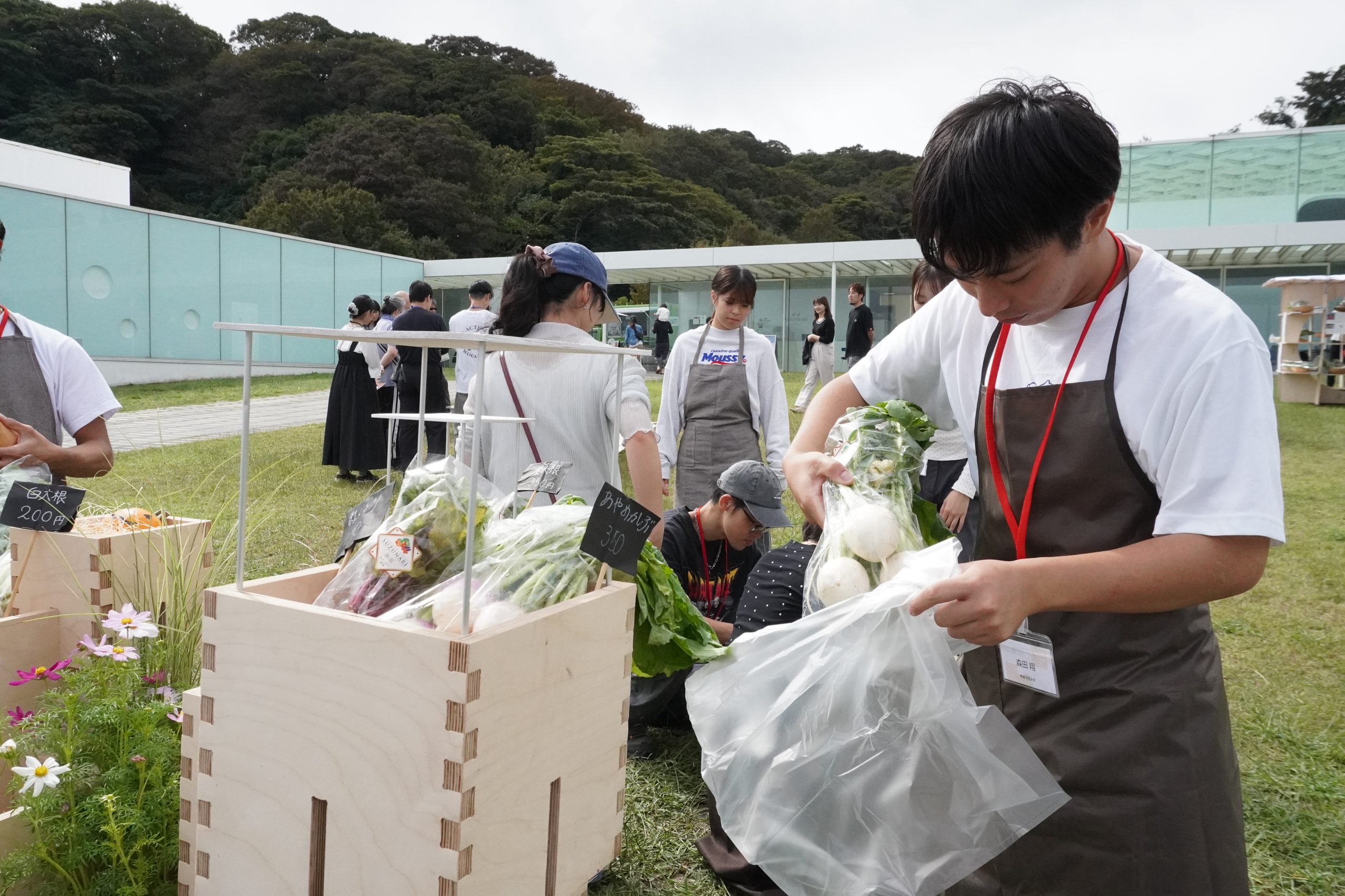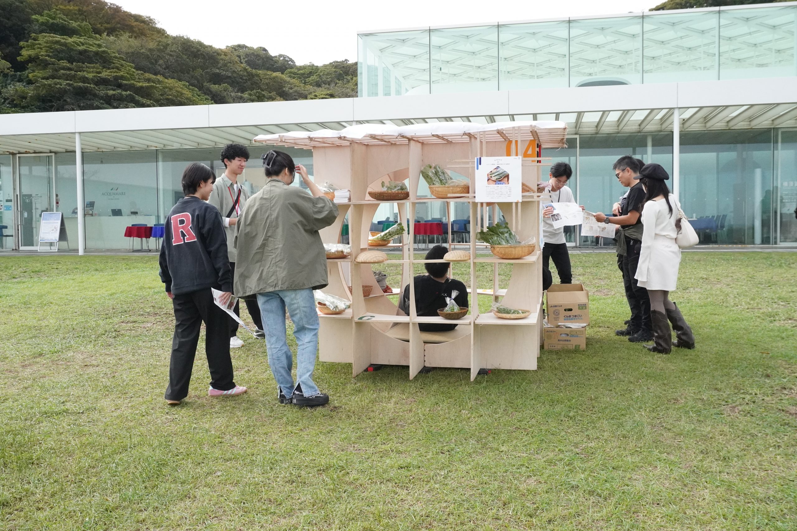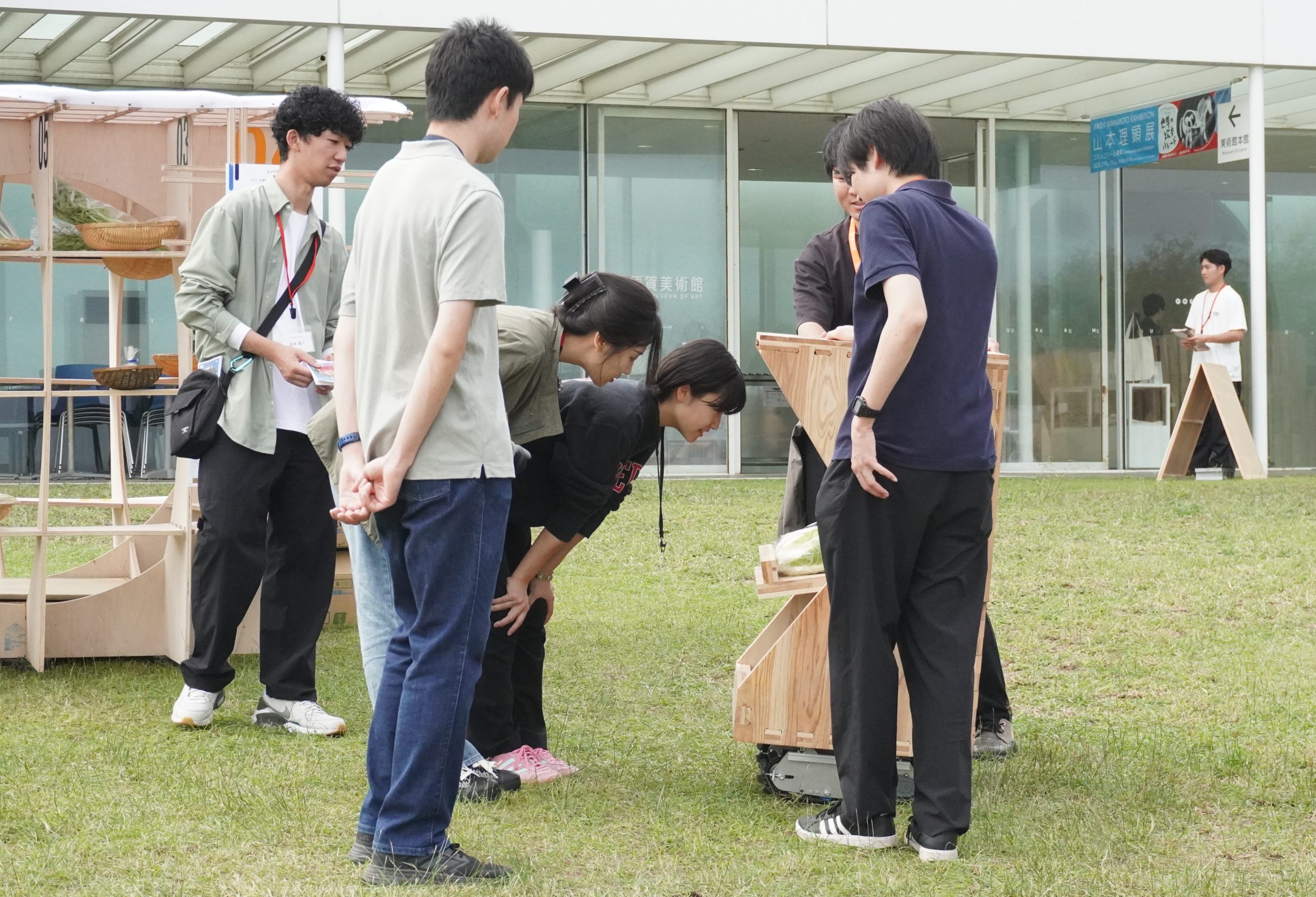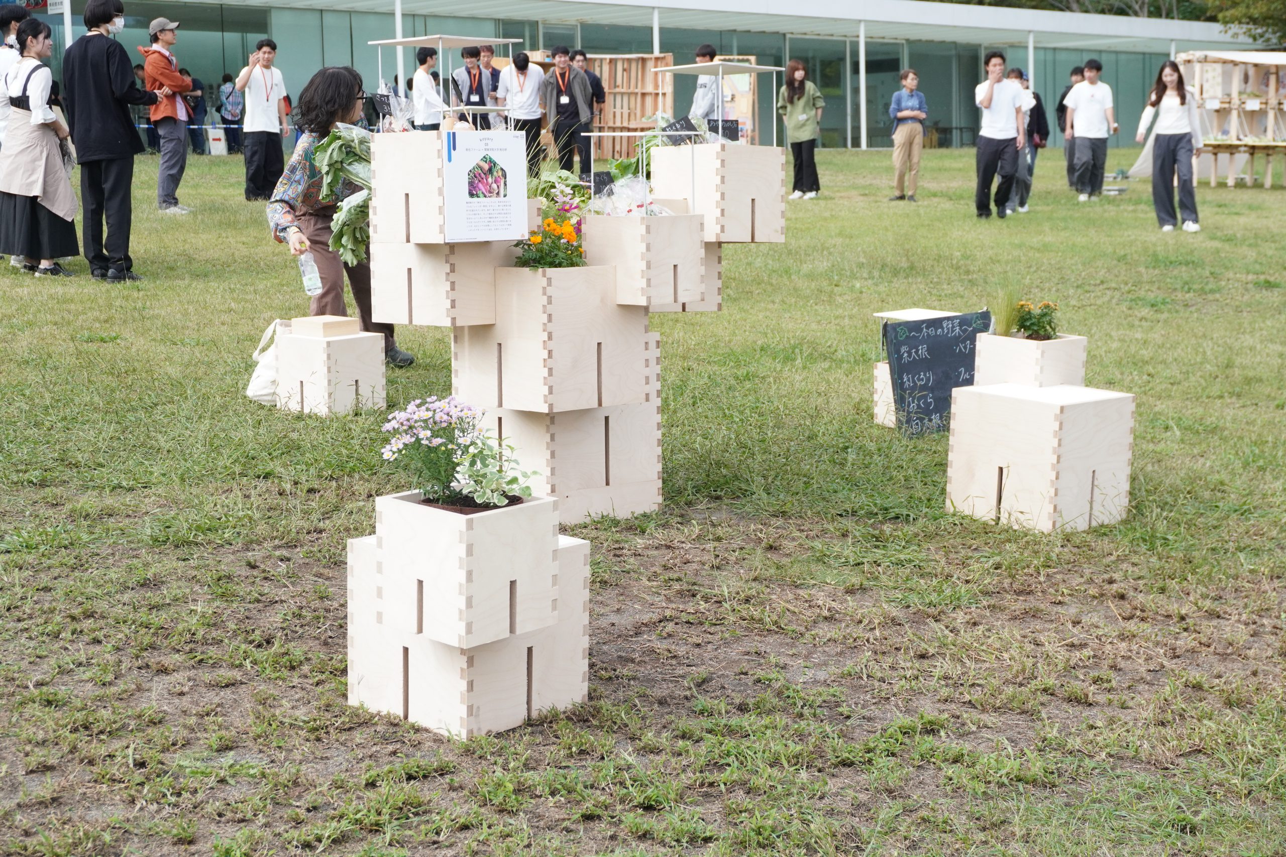 粕谷研のデザインを提案した宮本さん(同研究室4年)は「形を変えられると面白いと思い、レゴブロックから着想を得てデザインを行いました。どうしたら野菜を置けるか試行錯誤しながら、シンプルながらもデザイン性と機能性を兼ね備えたデザインになったのではないかと思います。お客様から構造について質問を受けたり、たくさんの方に興味を持っていただけて嬉しいです」と話しました。イベント当日は、傾斜でもまっすぐ立てるような工夫を施すなど、置く場所に応じたデザインの必要性も学んだ様子。粕谷教授は「模型制作では原寸でどのように成り立つかを正確に理解することは難しいです。実寸大の制作により、図面やCGでは想定しきれない課題が必ず生じますが、そうした問題を自ら発見し解決方法を見つけてもらう取り組みでもあります。デザインと壊れにくさなどの機能を両立させ、社会に求められるものはどういうものなのか、実体験として学んでほしいですね」と学生へ期待を込めました。また、デザインだけではなく、いま世の中にある素材をどのように使って新しいものを生み出すかという視点も欠かせません。学生たちはKOYARTの取り組みを通し、材料についても学ぶ機会となっています。イベントでは、他大学の学生とお互いが制作したデザインについて交流も行い、たくさんの刺激を受けた様子です。