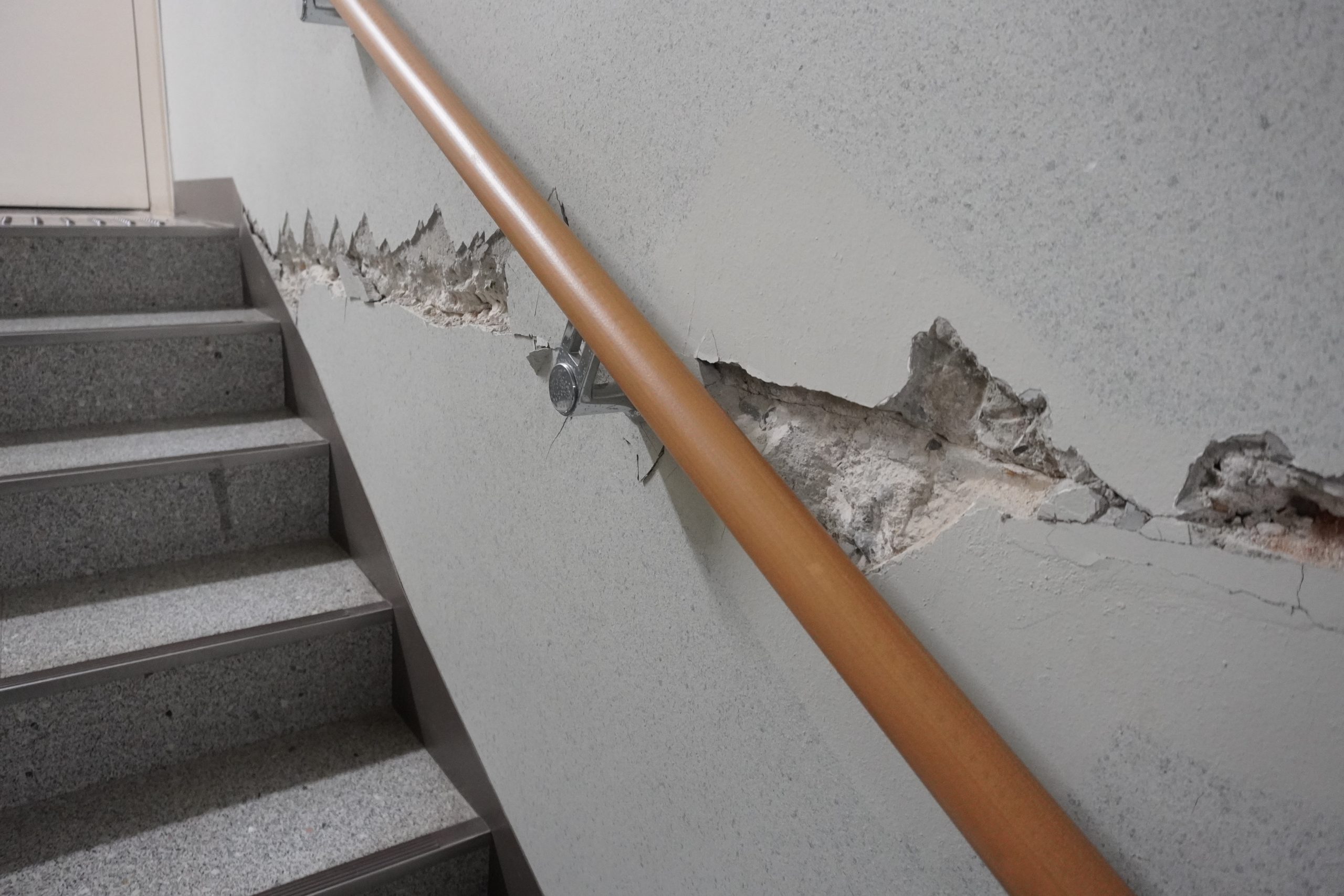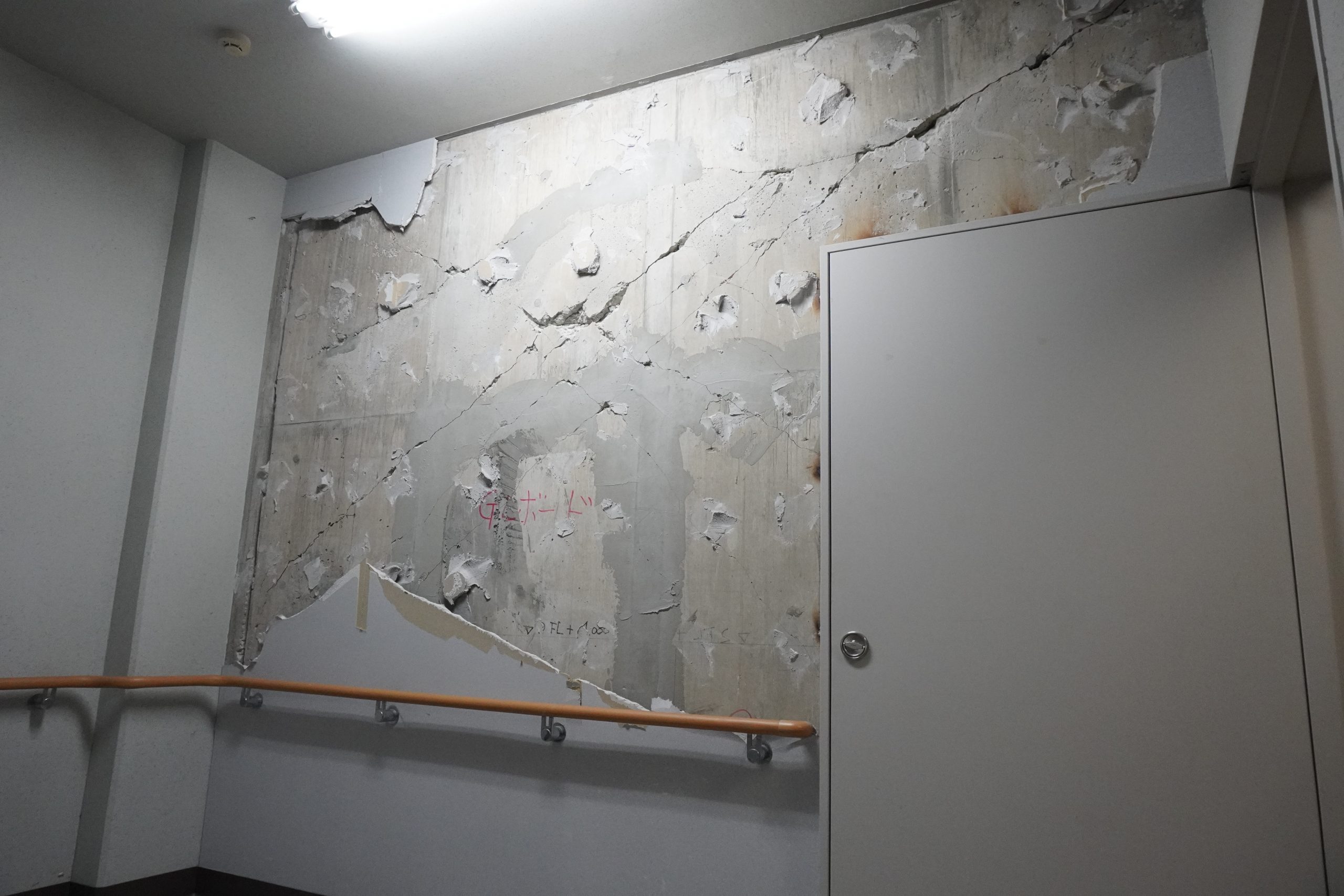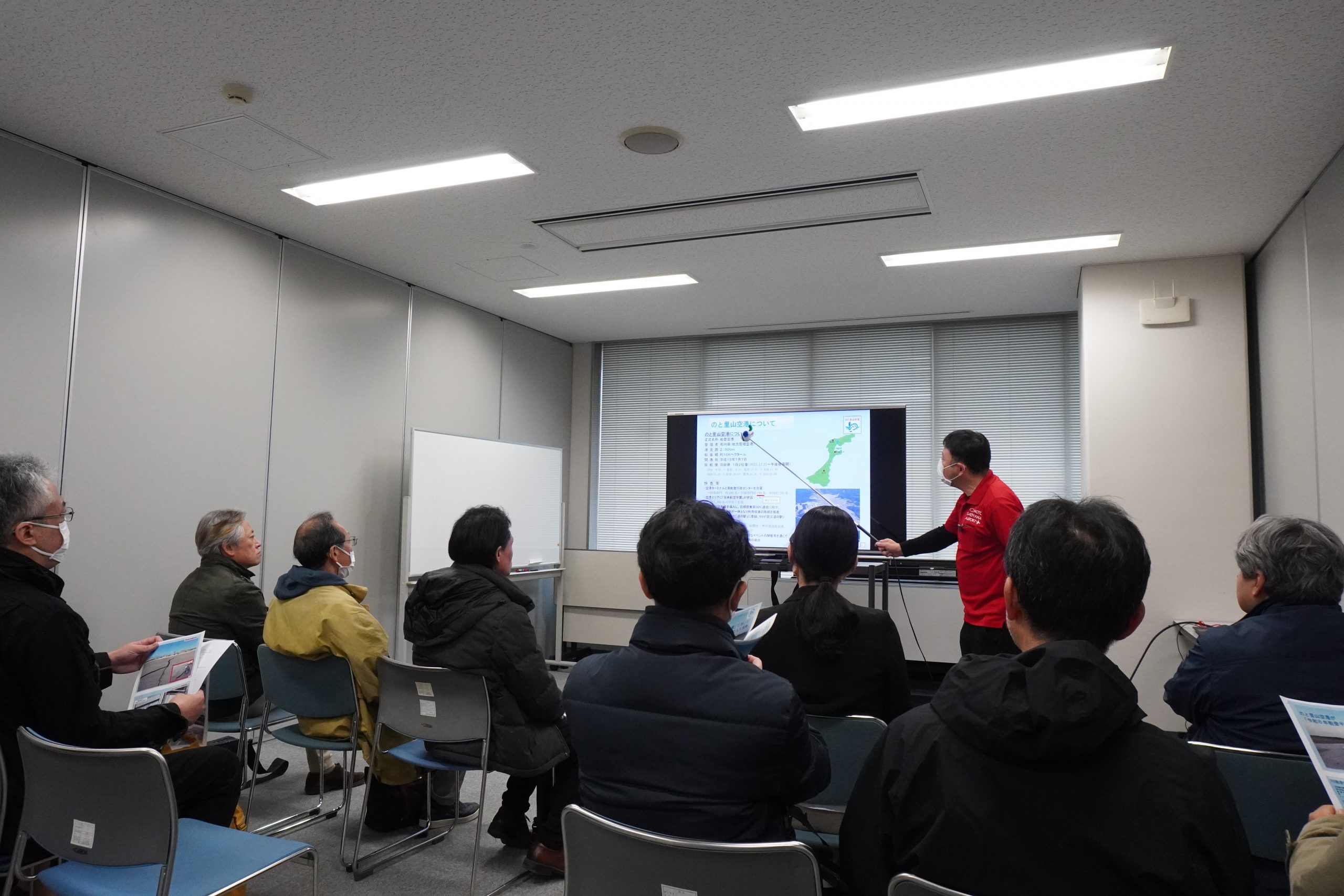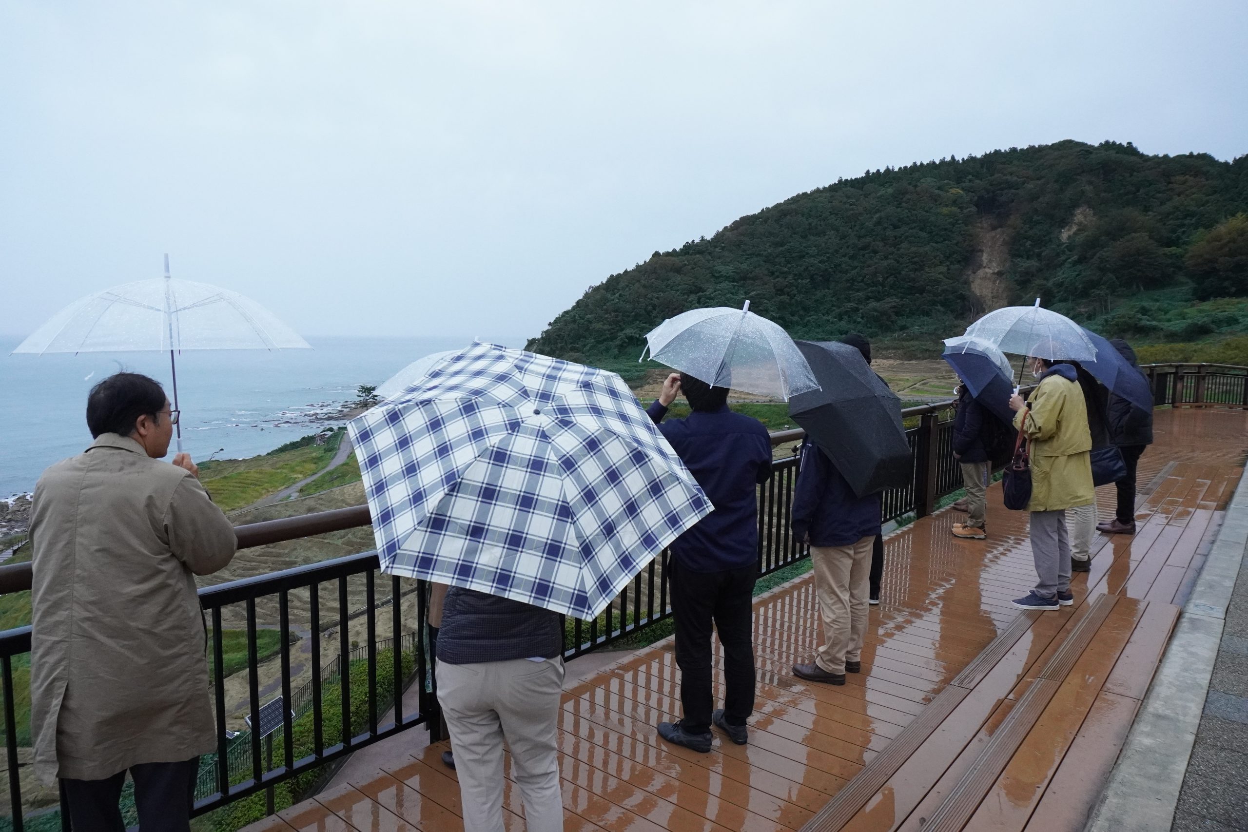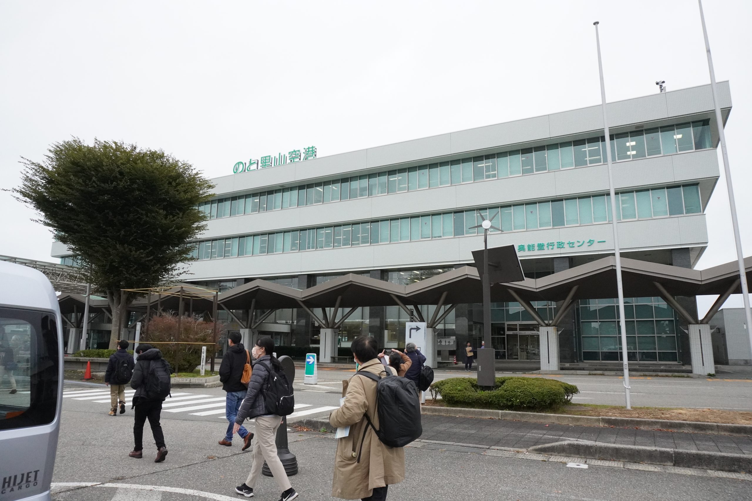 10月31日(金)には、能登半島被災地視察ツアーが実施され、地震時に防災拠点となったのと里山空港に隣接する奥能登行政センター⇒見附島(地盤沈下エリア)⇒すずなり食堂(被災店舗が共同で経営する仮設飲食店)⇒輪島市町野町中心部(豪雨災害エリア)⇒一般社団法人現代集落⇒土砂崩れにより寸断された道路や隆起か所に通した道路を経由して世界農業遺産“能登の里山里海”白米千枚田⇒輪島朝市通り(火災エリア)⇒黒島地区および黒島漁港(3m以上の隆起、砂浜が200m広がったエリア)の現場を視察しました。奥能登行政センターでは、職員の方から震災時の、のと里山空港の状況をお話頂きました。地震発生時にのと里山空港には搭乗予定者や出迎え者など約200名がターミナルビル内におり、その後の交通渋滞に巻き込まれた車や近隣住民など避難者が約600名にまでなったそうです。のと里山空港は2021年に「防災道の駅」に選定されており、幸いにも、水・食料・毛布などの備蓄がされていました。発災時には多くの避難者を受入れるとともに、支援物資や2次避難者の搬送拠点としての機能や、自衛隊等の復旧支援機関の活動拠点として活用されました。ターミナルビルや隣接する行政センターでは多数の箇所で壁の剥離やクラックが発生し、一部は今もなお修理されないままとなっており、震災時の様子を窺い知ることができます。