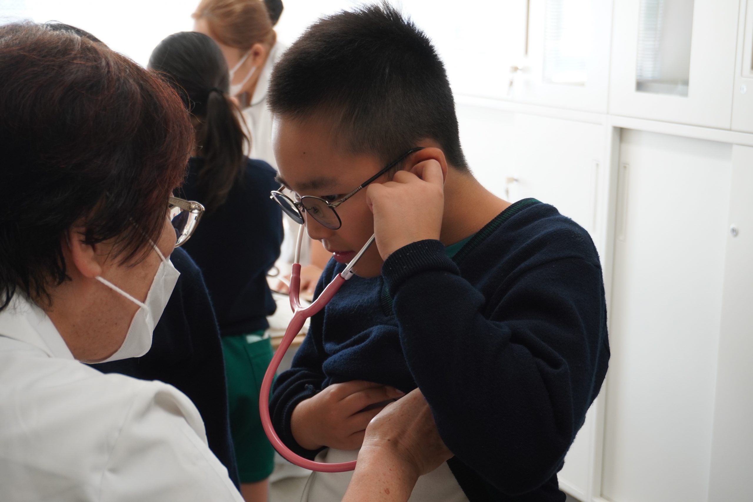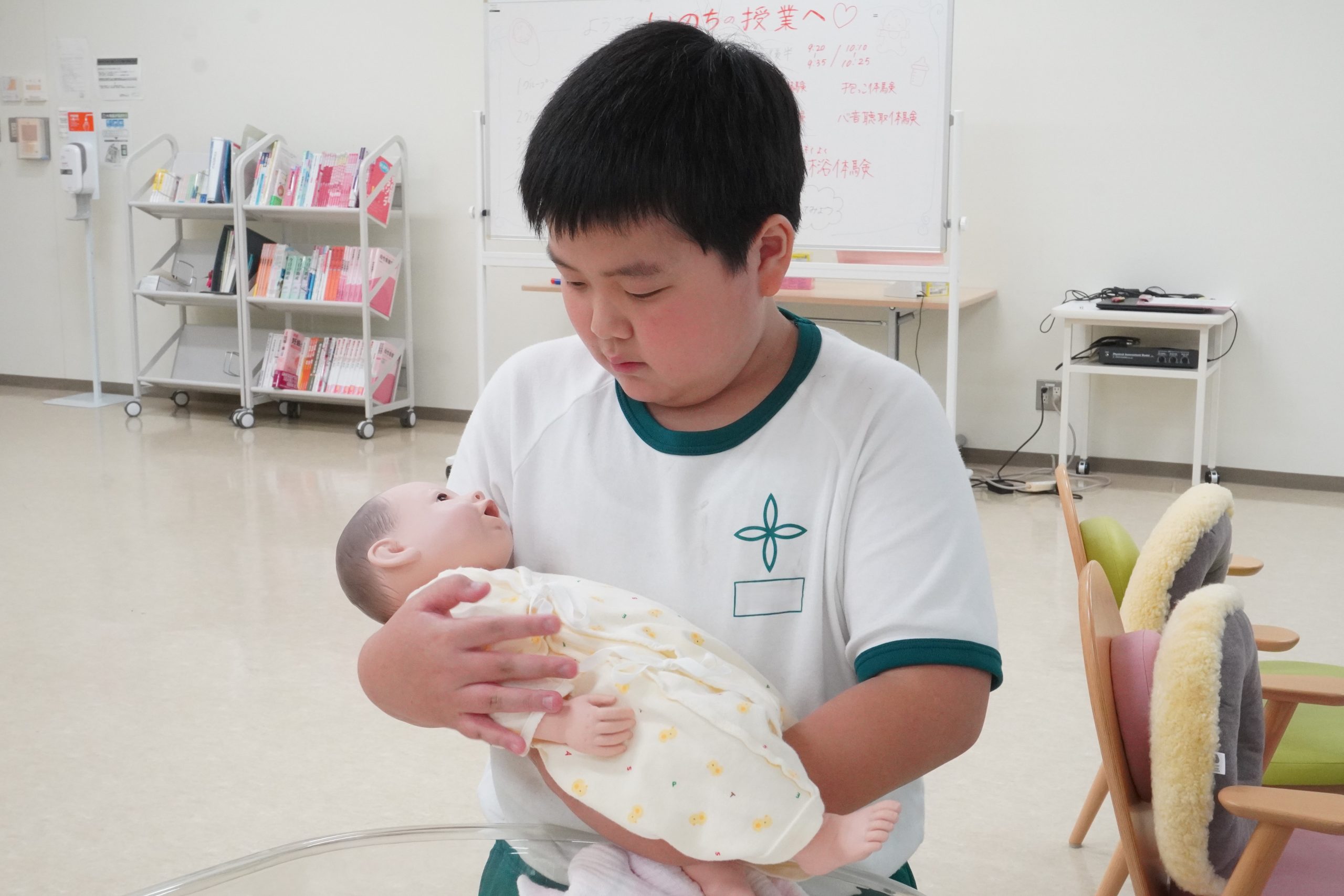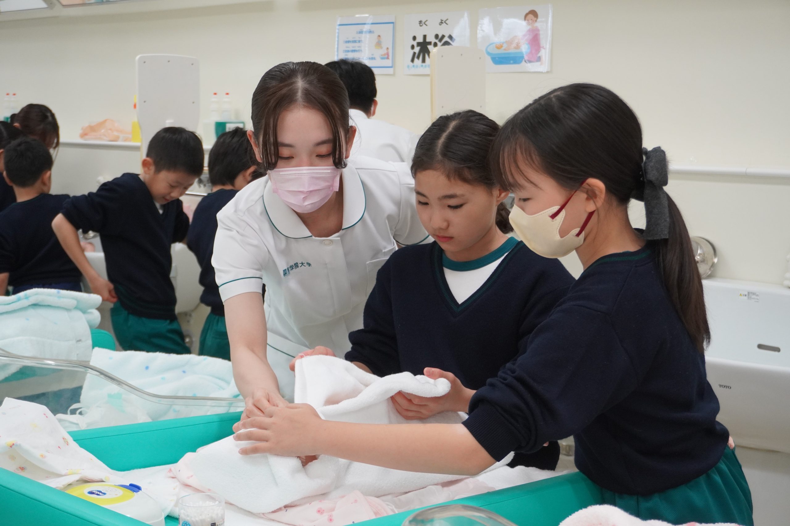 当日は学生たちが講師となり、新生児モデル人形を使用した沐浴や抱っこ体験、妊婦体験、児童が自身の心音を聴く体験などを実施しました。これらの体験を通して、児童それぞれが大切に育てられてきたことを想像し、かけがえのない”命”を実感するとともに、家族をはじめとした身の回りの人への感謝の心を育むことを目指して開催しています。学院内の小学校と連携したこの取り組みは、学部設置当初から毎年継続して行っており、今年で12年目を迎えます。