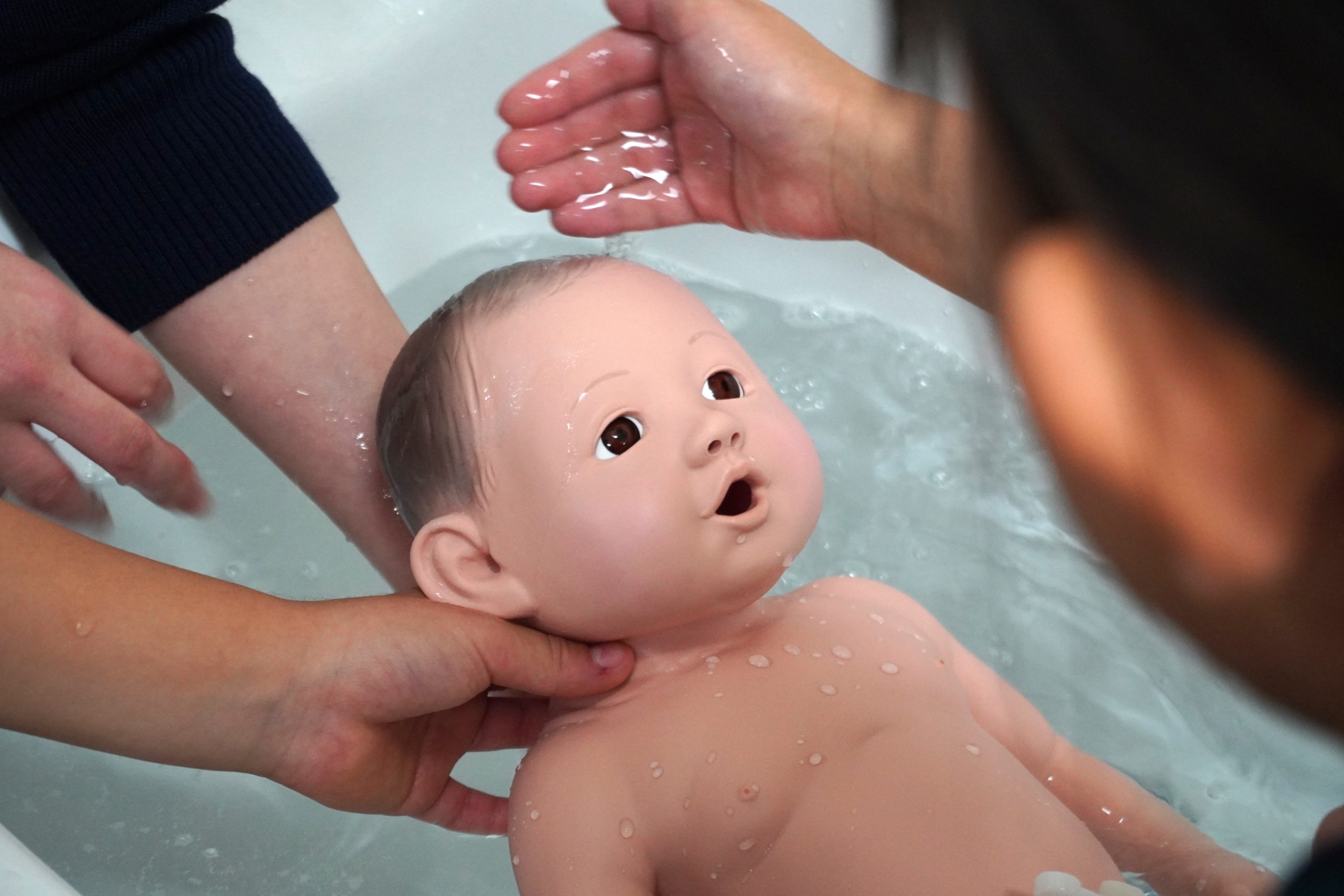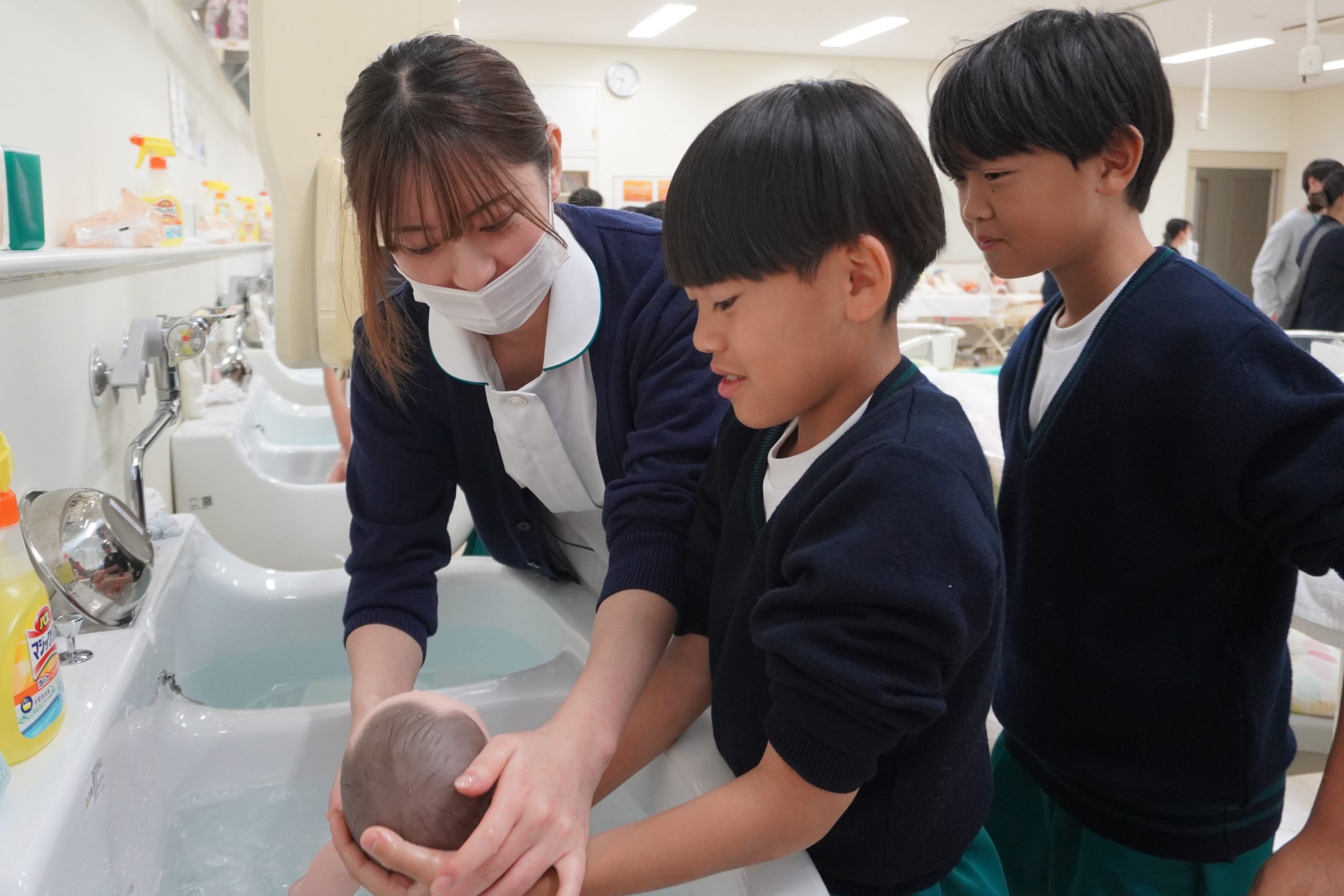 新生児と同じ約3kgのモデル人形の重さに苦戦しながら沐浴体験をする児童たちに、学生は「家族の皆さんは、皆さんのことを大切に思っているから、重くて大変でも毎日お風呂に入れてくれていたんだよ。お家に帰ったら、産まれた頃のことを家族にたくさん聞いてみてね」と声をかけ、児童の想像を促すように丁寧に接する様子がうかがえました。