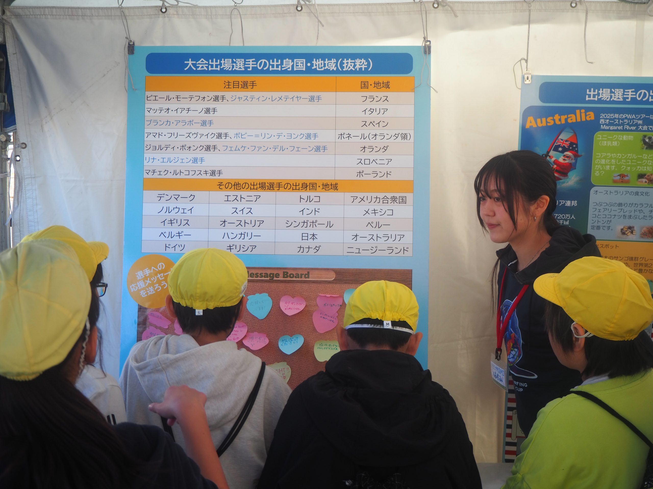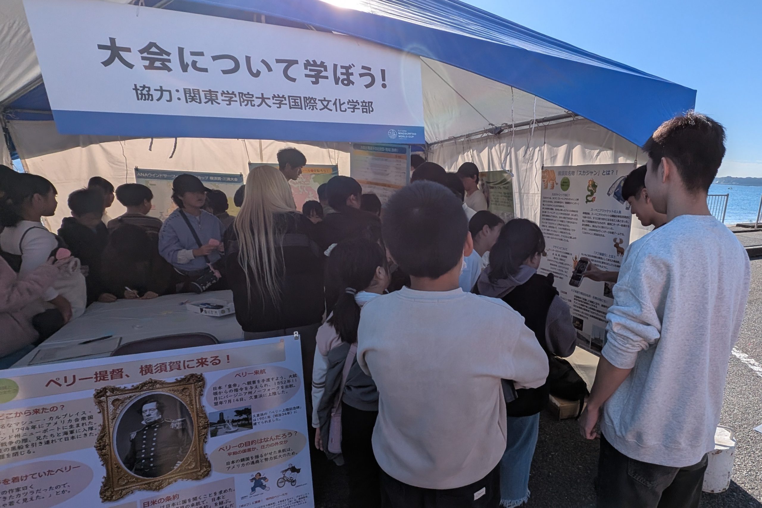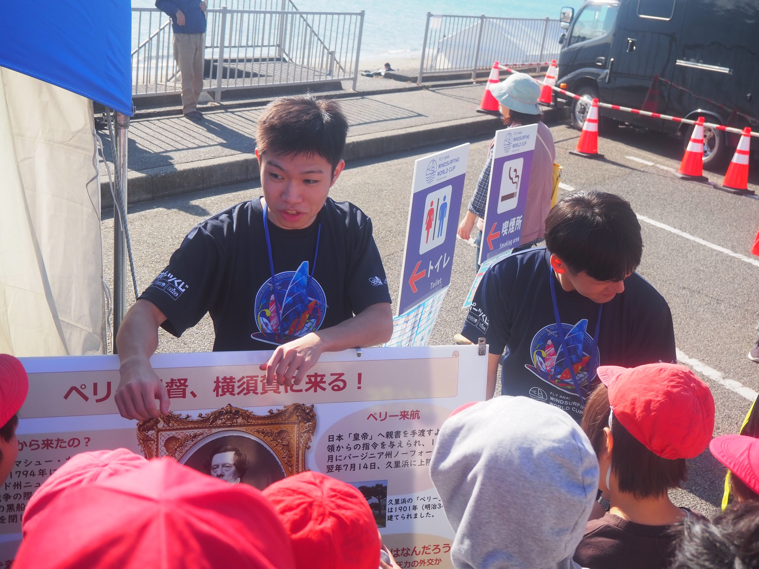 展示ブースのパネルでは、国際文化学部の2年生が中心となり、約4〜5週間をかけて制作されたもの。大会出場選手の出身国や地域の文化紹介、横須賀・三浦地域の歴史・文化に関するパネルなど9枚が展示されました。特に小学生にも分かりやすい解説を心がけた展示構成とし、ペリー来航など地元の歴史を交えて、国際的なつながりを楽しく学べる内容としました。当日は、来場した北下浦小、津久井小の児童に向けて学生自身がガイドを務め、展示内容を紹介。「小学生でも理解できるように言葉を工夫しました」「意外と興味を持って聞いてくれたのが印象的でした」と話すのは、比較文化学科の遠藤琉生さんと新谷直さん。実際に人に伝える難しさと楽しさを体験する貴重な機会にもなりました。
