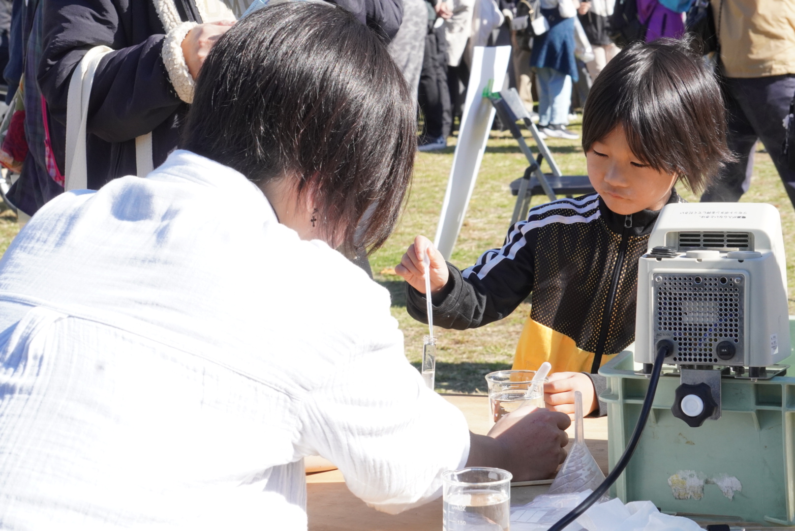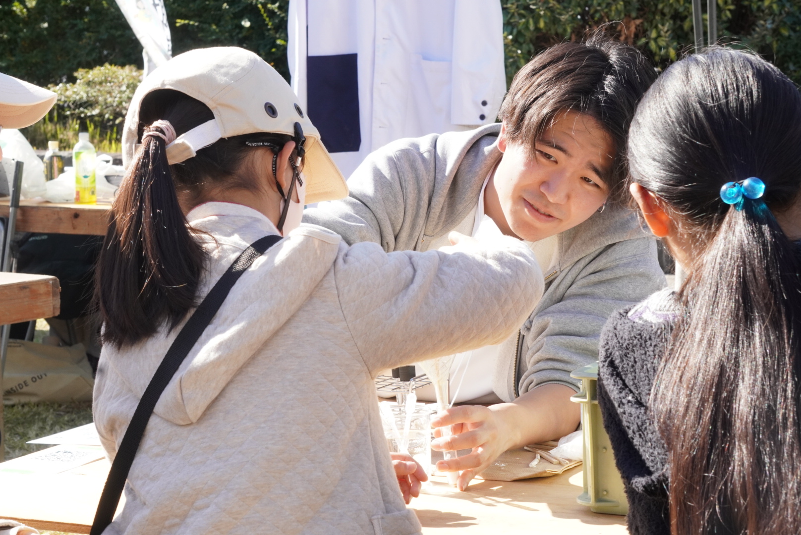 体験した子どもたちは「なんで結晶ができるのかな」、「自分でも作れるようになりたい!」と興味津々の様子。保護者の方々も学生に結晶化の原理を尋ねるなど関心を寄せる姿が見られ、子どもから大人まで身近な自然科学の仕組みに触れ、その魅力を体験するひとときとなりました。