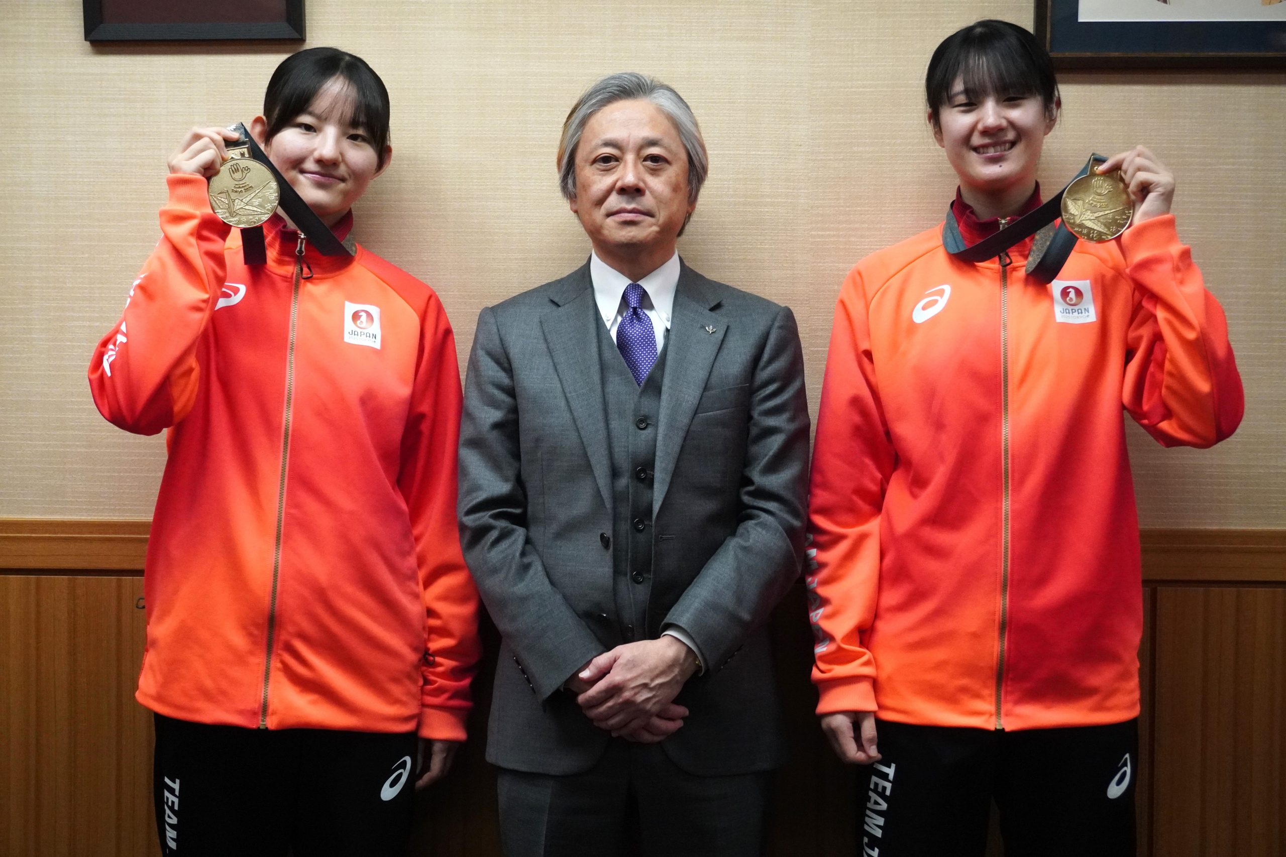 加藤 志希選手(写真左)、小山学長(中央)、加藤 志野選手(右)