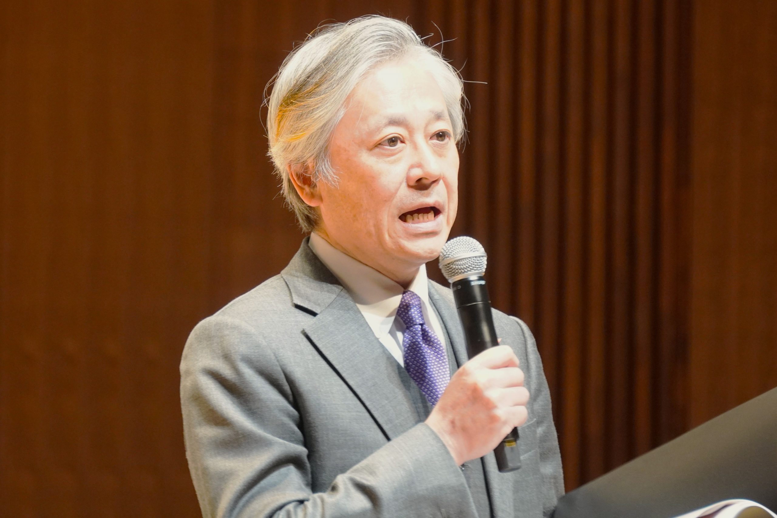 冒頭、小山学長は「クリスマスアカデミーは今年で3回目。音楽とトークを楽しみながら、横浜のキリスト教の歴史や文化を深く知る機会としてほしい」と挨拶。続いて壇上に上がった長田氏と中村氏による『アヴェ・マリア』の演奏が行われました。演奏後に長田氏は「同じ『アヴェ・マリア』でも作曲家や時代によって表現は異なる。今日を通じて、音楽による祈りの多様性を感じていただければ」と語りました。