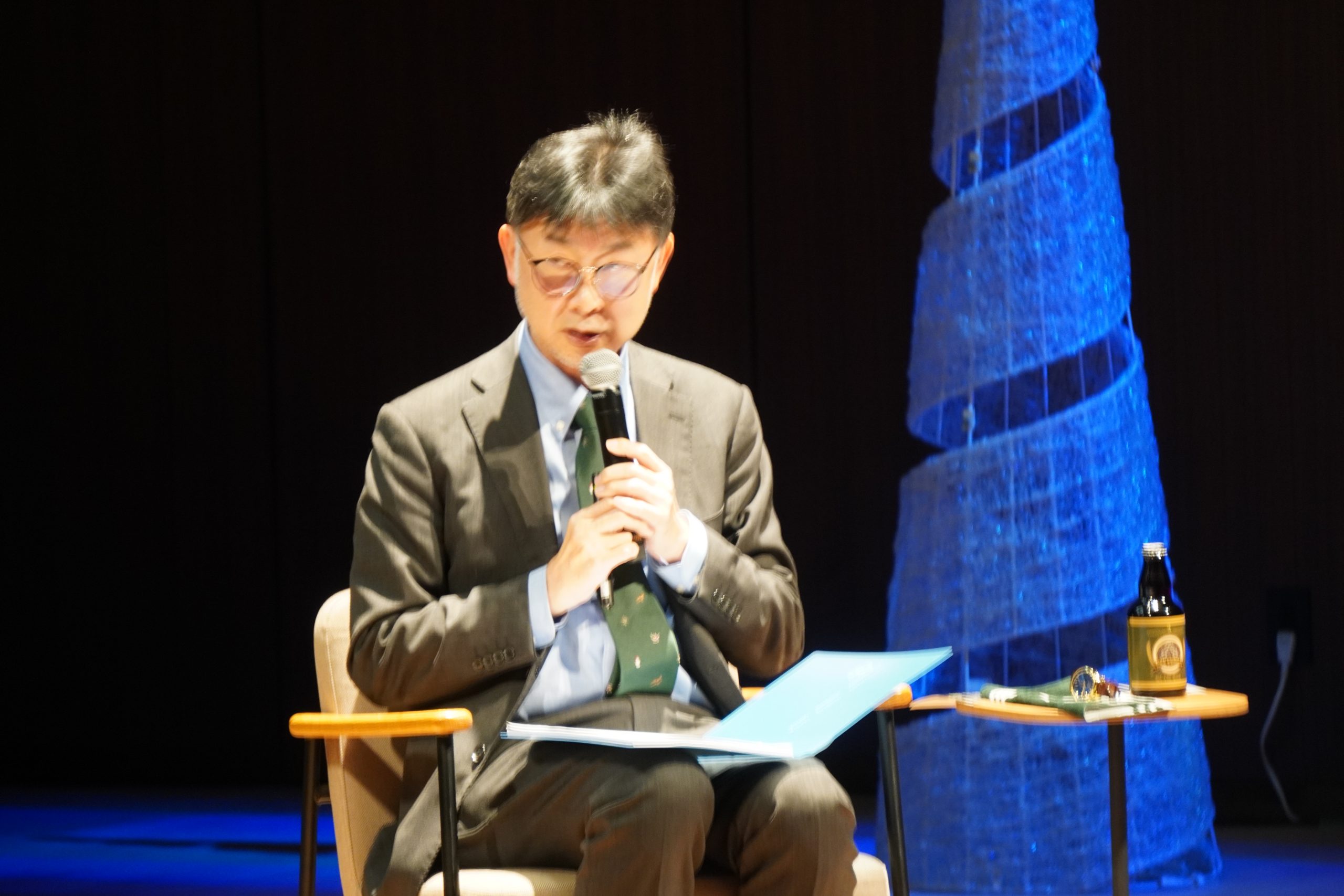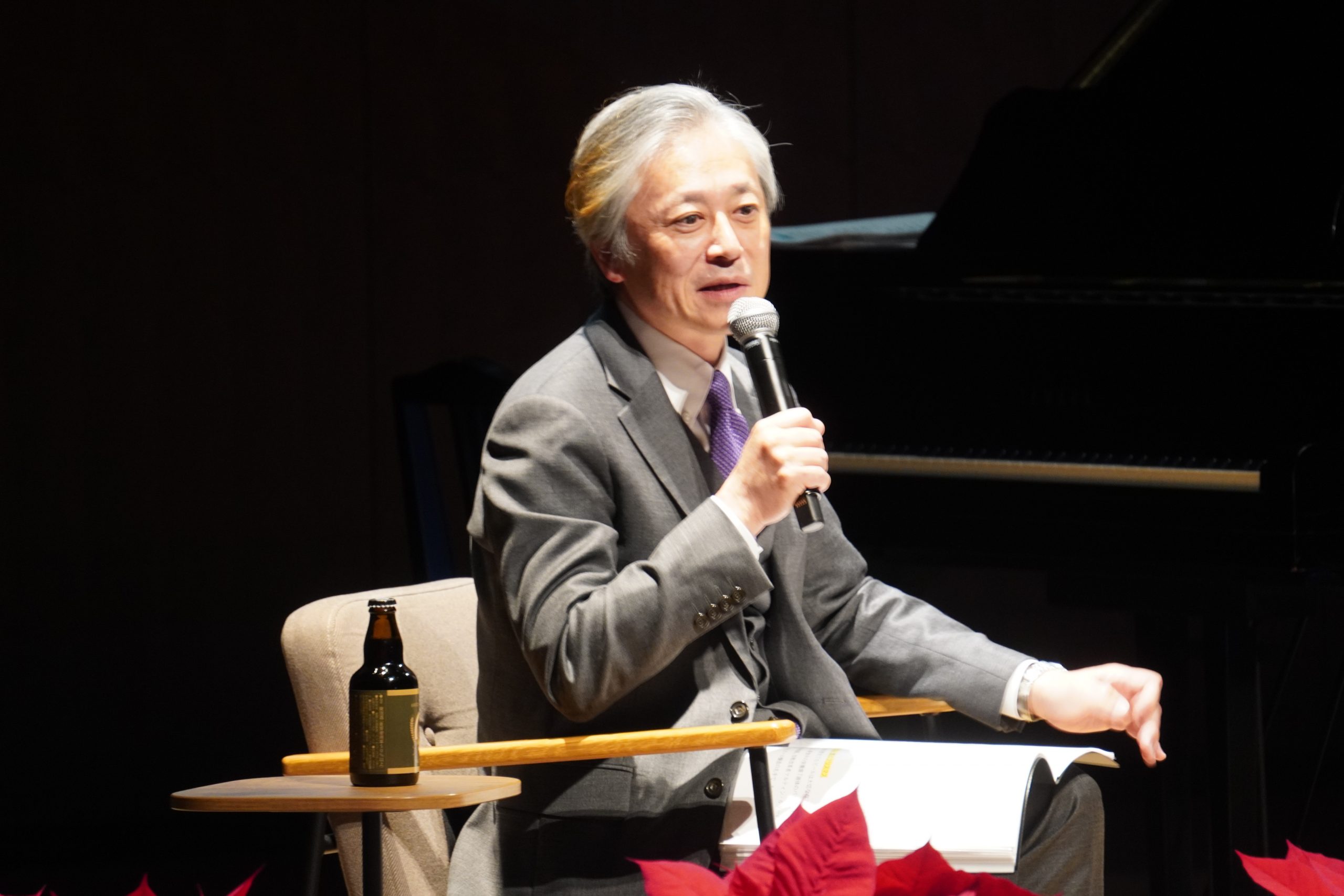 続いて、小山学長と髙井宗教主事によるトークセッションが行われました。最初のテーマは「キリスト教とビールの関係性」と「『アヴェ・マリア』の意味と表現の多様性」です。髙井宗教主事は、古代メソポタミアのシュメール文明で誕生したビールの歴史に触れ、旧約聖書に登場するアブラハムもその文化圏でビールを飲んでいた可能性があると解説。さらに、中世の修道院では断食中の栄養源としてビールが用いられ、宗教改革者マルティン・ルターの妻も醸造に携わっていたことを紹介しました。あわせて、教職員や学生、クラフトビール会社と連携して進めている「KGU乾杯プロジェクト」に言及し、シュメール人が飲んでいたとされるビールを現代に蘇らせた「KGUシュメール」を紹介。「ビールが麦から液体へと変容し、人々に喜びをもたらすように、クリスマスもまた、神の子の降誕によって喜びがもたらされる」と語り、両者に共通する「変容と喜び」のテーマを強調しました。また『アヴェ・マリア』については、天使ガブリエルの「おめでとう、マリア」という言葉に由来する祈りであり、冒頭で長田氏が口にしたようにシューベルトやグノー、カッチーニなど、様々な作曲家が『アヴェ・マリア』を楽曲として遺しており、作曲家や時代によって音楽表現が大きく異なることを紹介。「祈りは一つの形に固定されるものではなく、その時代の人々の心を映し出してきた」と述べ、音楽を通じた多様な祈りの在り方を示しました。