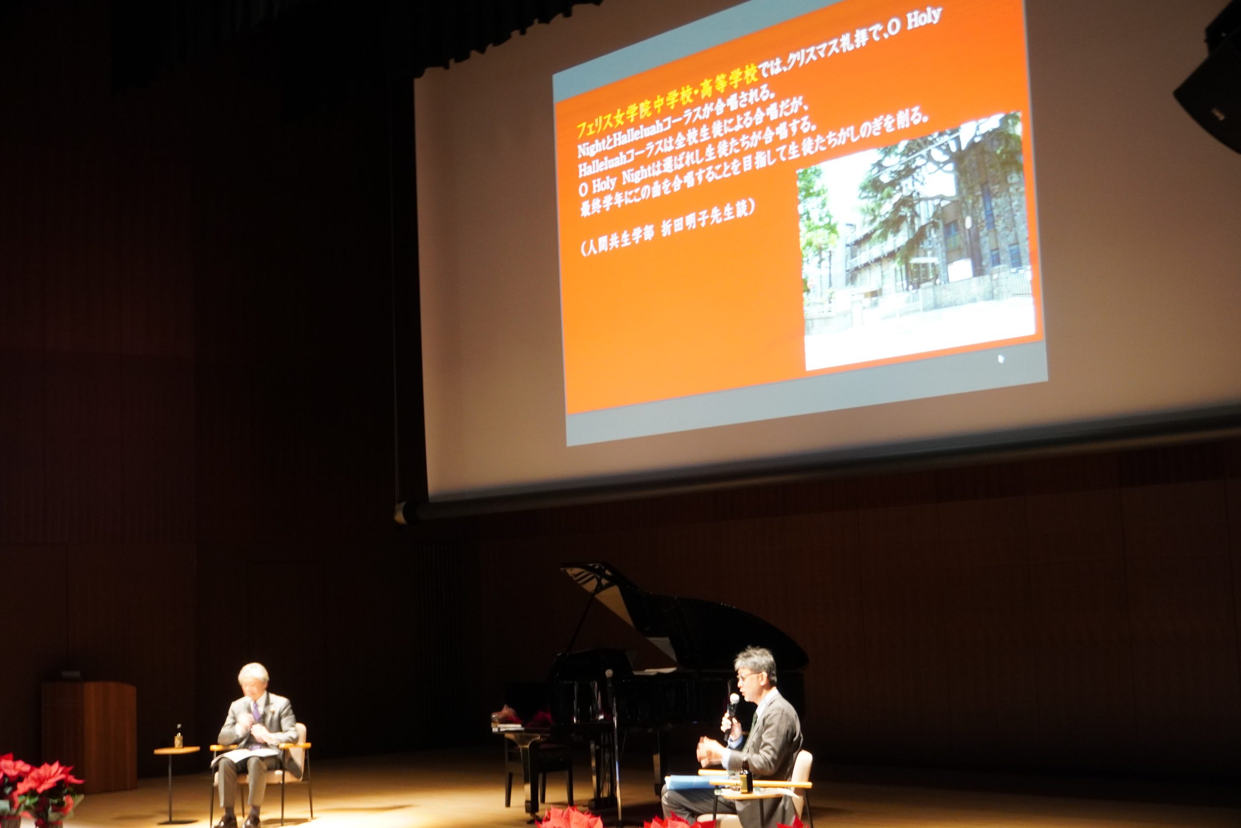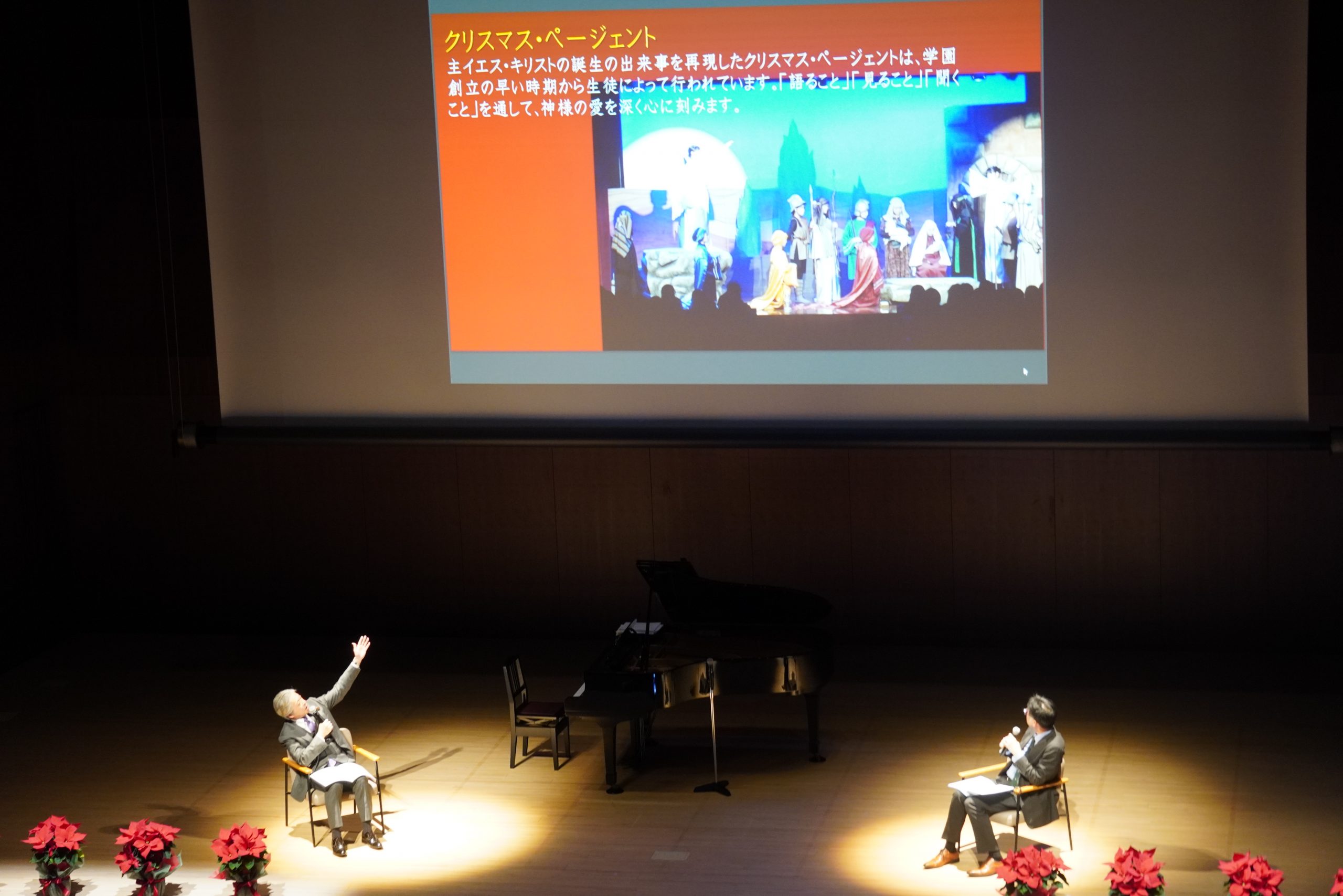 12月17日、横浜・関内キャンパスにて、「Christmas Academy」が開催されました。今回は、ソプラノ歌手の長田 有加里氏、ピアニストの中村 優花氏を迎え、小山 嚴也学長と大学宗教主事の髙井 啓介教授が横浜とクリスマス、そしてキリスト教にまつわる歴史や文化を紐解くトークセッションを音楽を交えながら行いました。
