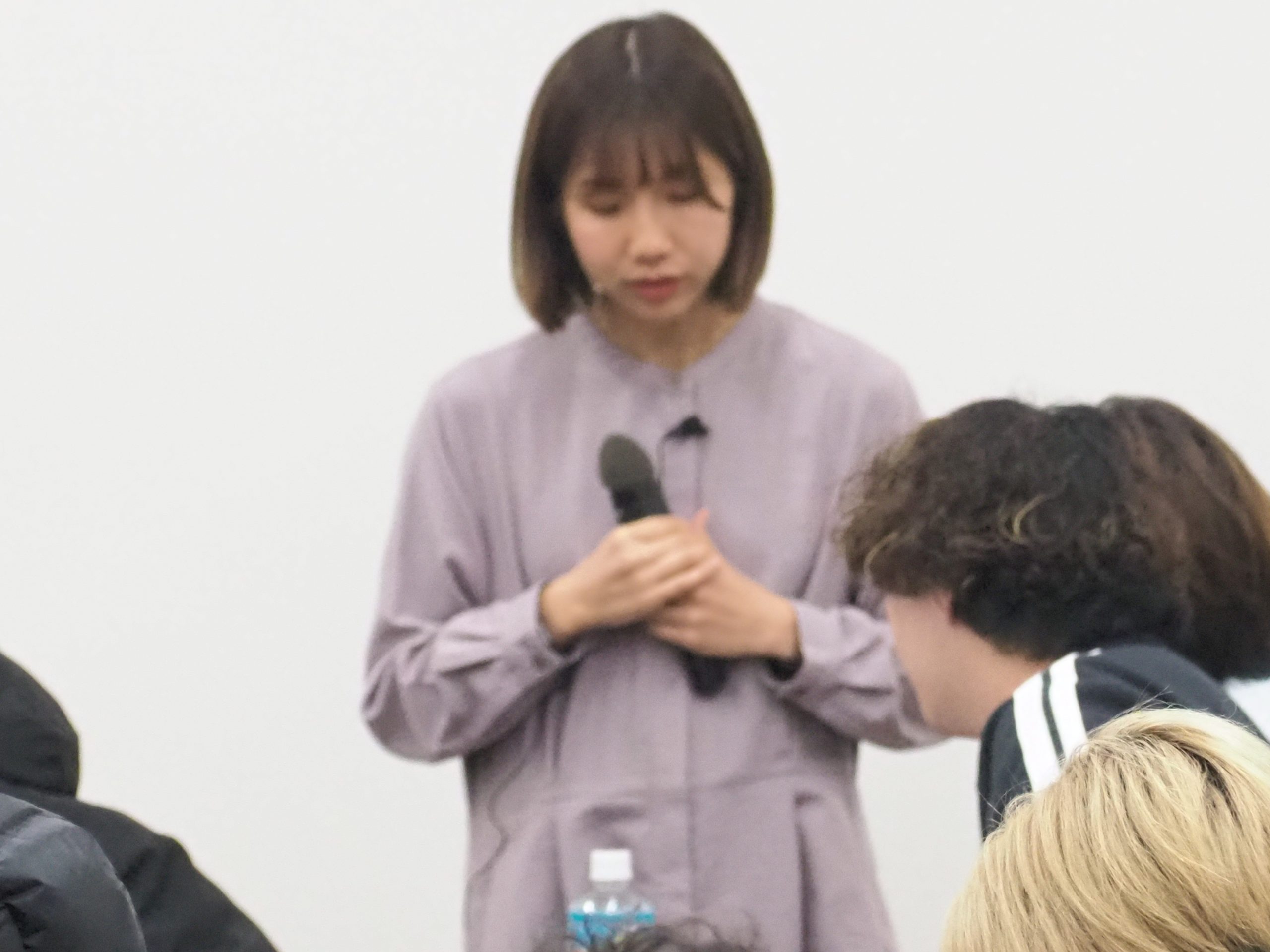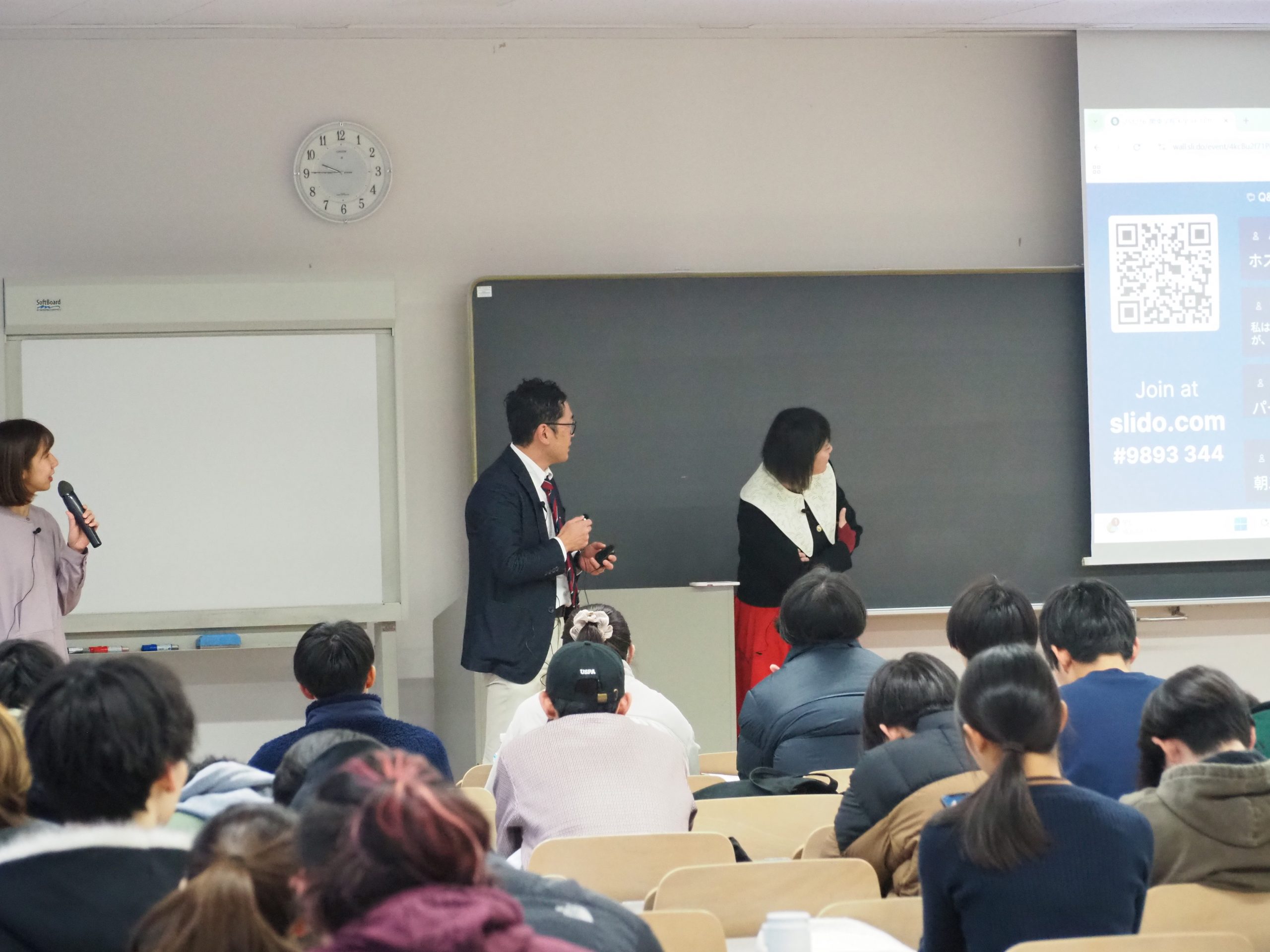 ゲストトークでは、異なるキャリアを歩んできて結ばれた2人の登壇者が、自身の選択や葛藤について率直に語りました。転職や結婚、出産・子育てといったライフイベントを通じて価値観がどう変化したのか、仕事と家庭をどのように両立しているのかなど、教科書では学べないリアルな経験談に学生たちは熱心に耳を傾けていました。質疑応答では、将来への不安や選択に対する迷いが次々とあがり、登壇者たちは学生に「自分の価値観を大切にすること」、「変化を恐れずに選択すること」など、様々なアドバイスを行いました。