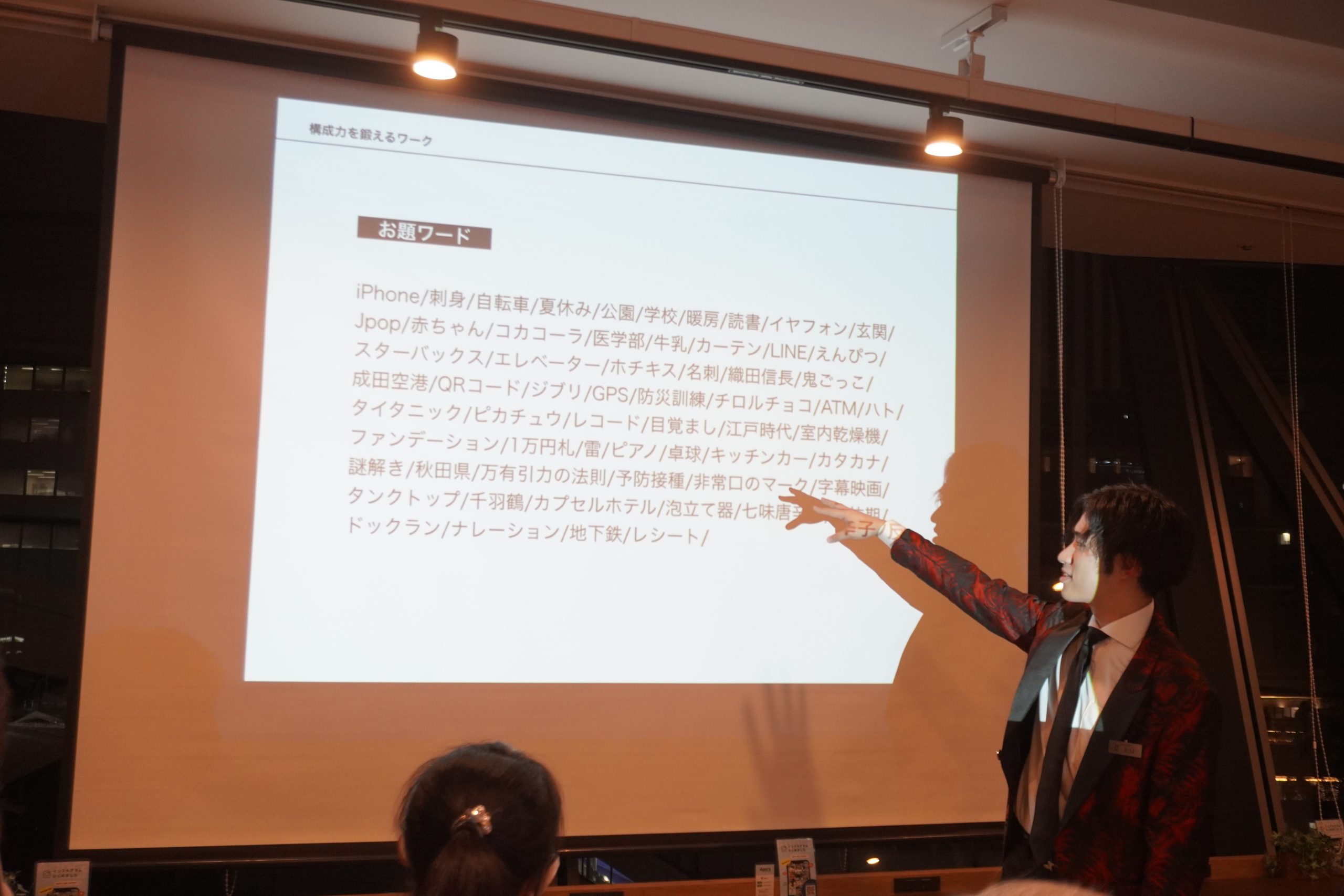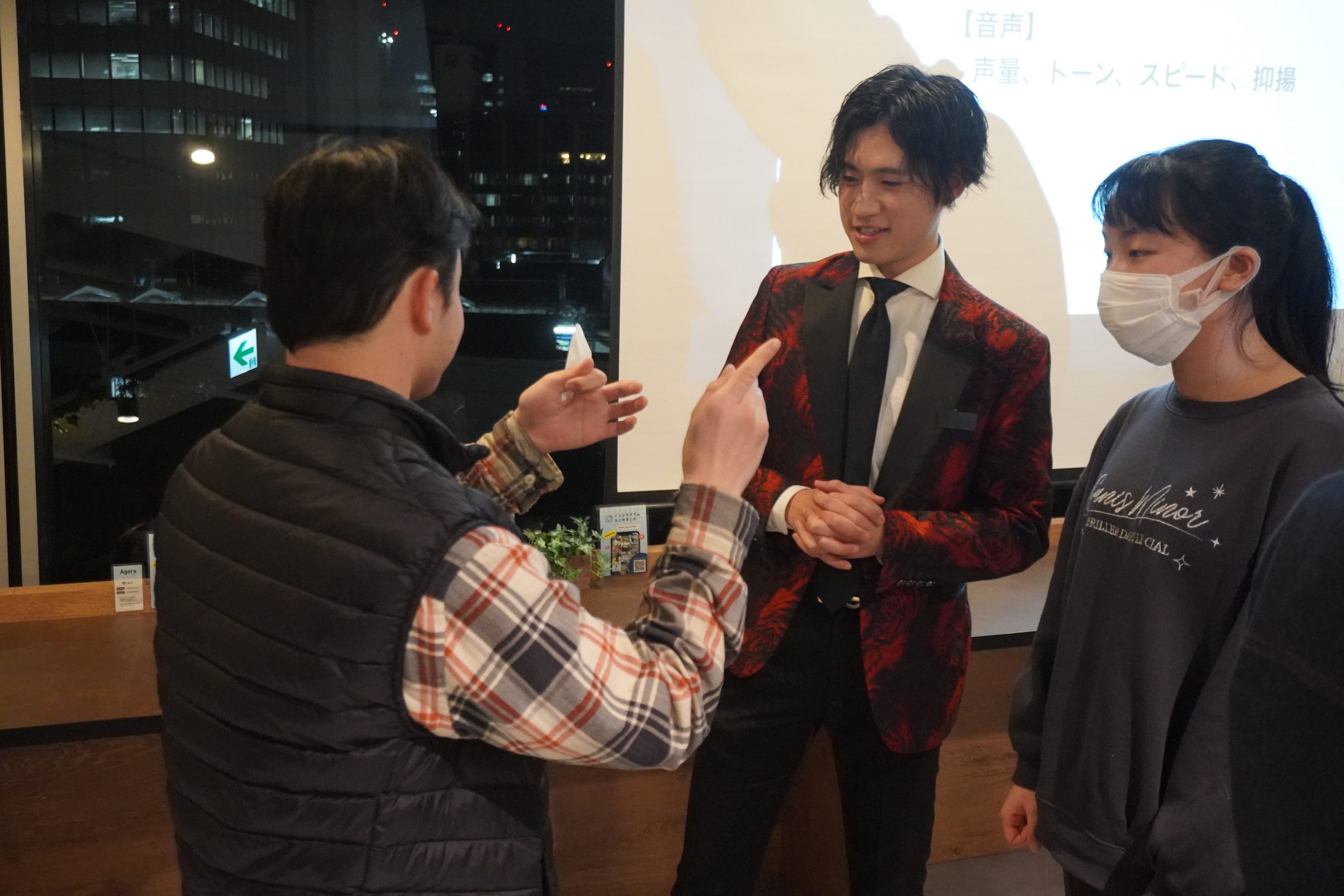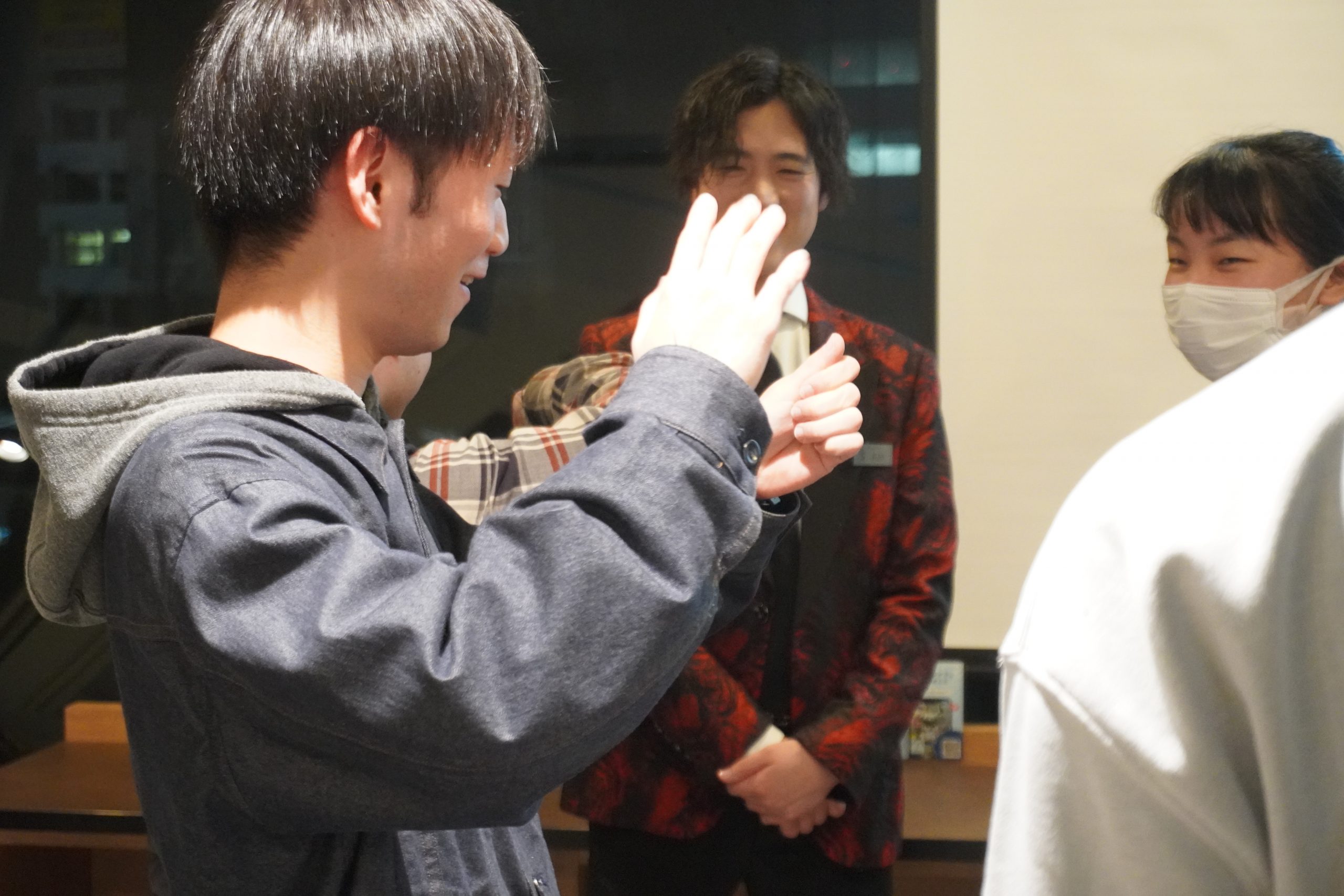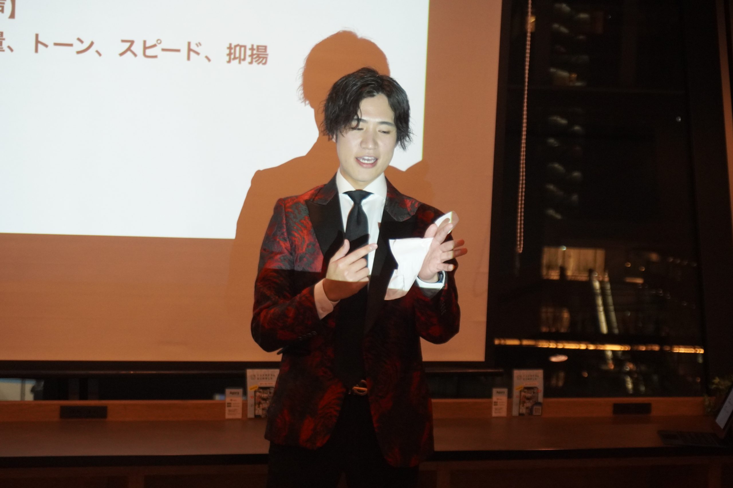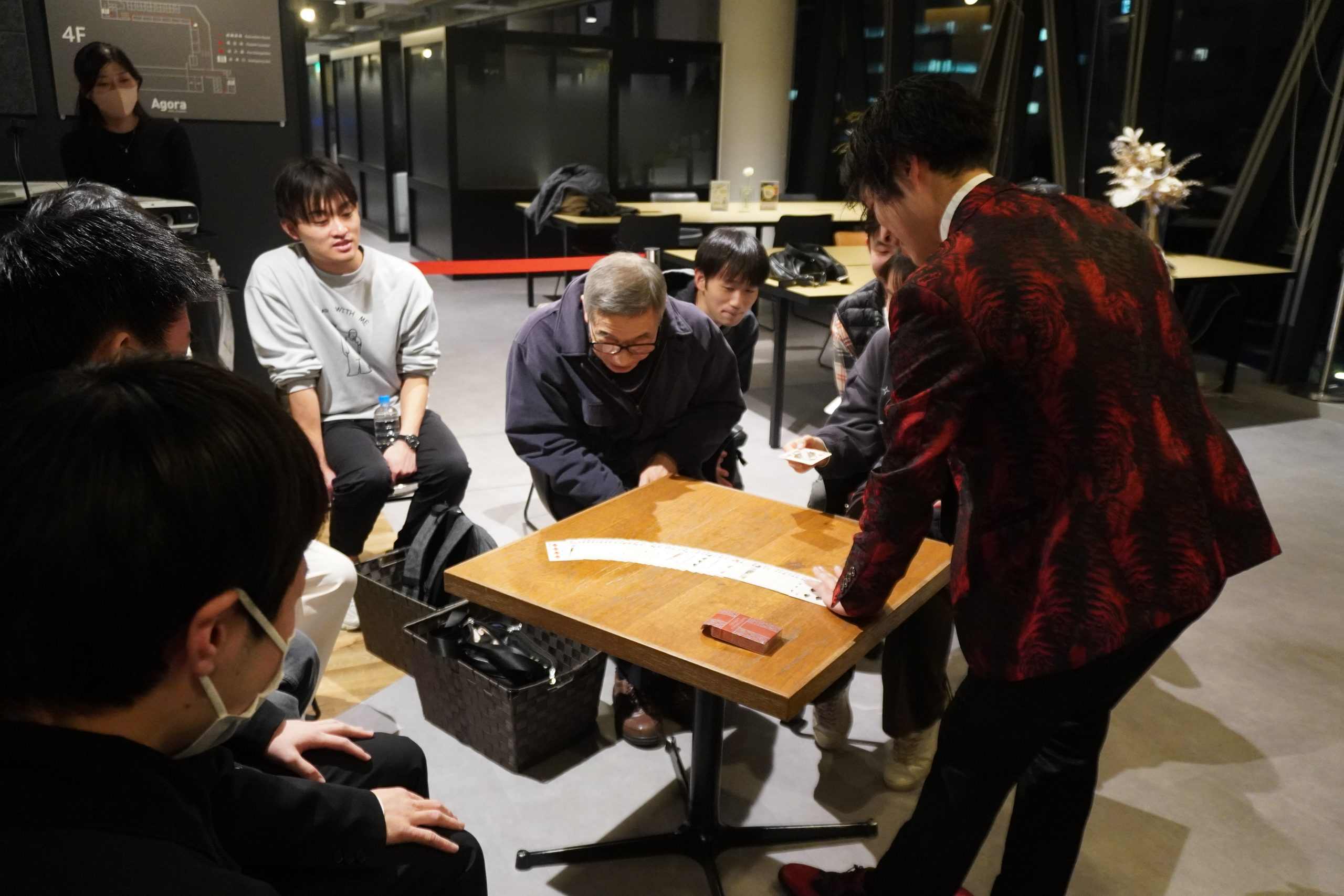 1月8日(木)には、プロのマジシャンによる“実践型コミュニケーション講座” 『MAGIC&TALK マジックで学ぶ、人を惹きつけるコミュニケーション』を開催しました。今回のイベントは、横浜・関内キャンパス4階に位置するコワーキング&シェアオフィス「AGORA KGU KANNAI」と協働し、学生のキャンパスライフに“出会い・学び・経験”という新たな価値を提供する目的で企画されました。SNSやオンラインが発達している現代において学生間でのコミュニケーションも多様化している昨今。「伝え方」がより相手の印象を大きく左右しコミュニケーションにおいてより大切になってきています。今回は「マジックで学ぶ、コミュニケーション術」をテーマに、プロマジシャンによるパフォーマンスを交えながら、相手の心を惹きつける“話し方”や“表現力”、“伝える力”を楽しみながら学びました。講師にお迎えしたのは、プロマジシャンとして数多くのイベント登壇やコンサルタント、またマジックを活用したコミュニケーション研修やワークショップを、企業や大学・地域団体向けに多数の実績をもつマジシャン「RAI」こと株式会社KISAI 代表取締役の関根良依氏。開催直後、トランプを使用したマジックが披露され、早くも参加した学生たちはその世界に入り込み関根氏の手元に視線はくぎ付けの様子。「手品という言葉を思い浮かべてください。手が1つに口が3つ。手先の技術よりしゃべりの方が3倍大事だということを“手品”という漢字が物語っています」と関根氏は話します。そこで、コミュニケーション力を高めるために学生たちが挑戦したのは、関根氏の組織でプロのマジシャンを育成するにあたって実際に行っている「1minutes A to B talk」。1分間でAの話題からBの話題へとつないでいくワークです。最初はお手本に関根氏が挑戦します。お題は学生たちがランダムに選んだワード(A)ジブリ、(B)QRコード。早速関根氏は話し始めます。「ジブリに代表する日本のアニメーションは、日本の文化・誇るべきコンテンツです。一方、QRコードはどこで開発されたか?QRコードは日本産です。しかも、新たなコードが世界中に広がり、ありとあらゆる人たちに使われる未来になったらと特許を開放。自ら開発した技術や製品がより多くの人びとに使われ、社会に役立つことが重要だと考えたそうです。そんな技術力と精神も日本の誇りだと思いませんか」と2つのワードを日本の誇れるものつながりで話しました。お題が決まった瞬間から(A)について話し始めて、途切れることなく1分間しゃべり続けて最後は必ず(B)の話題で終わらせます。続いて学生たちも1グループ3名に分かれて挑戦しました。チロルチョコと予防接種、七味唐辛子と雷など、難しい組み合わせのお題にも真剣に取り組み、それぞれのグループからは自然と笑いや拍手が起こるなど、盛り上がりを見せました。