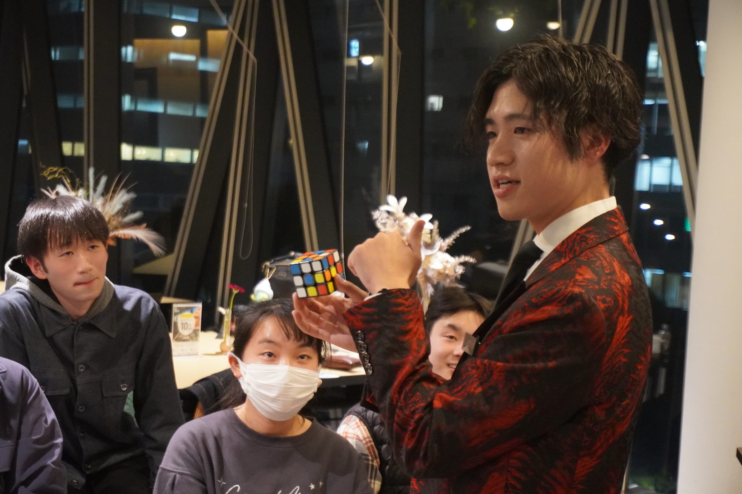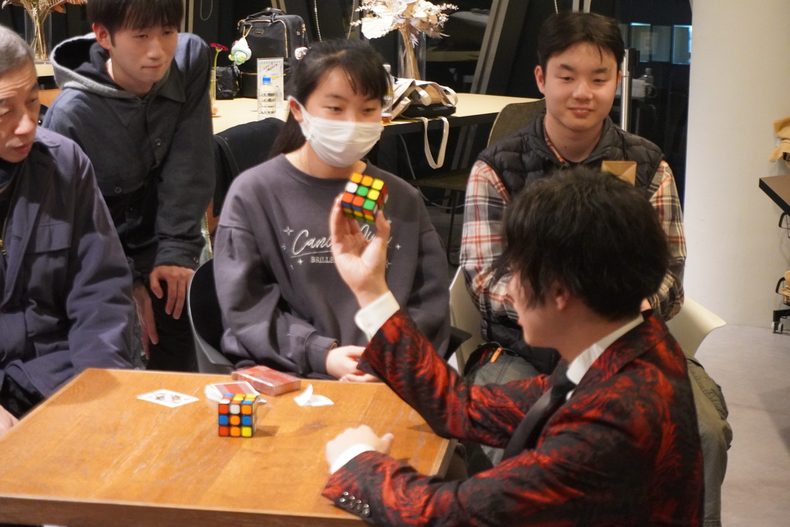 その後取り組んだのはティッシュペーパーを使用したマジックと見せ方。実際にマジックのやり方を関根氏から習い、それぞれ披露し合います。そこで、これまでに学んだコミュニケーションやプレゼンテーションの手法を用いて、いかに見る人を惹きつけられるかを実践しました。参加した学生たちは、「マジックとコミュニケーション、プレゼンテーションという一見関係ないことを、自然と楽しく学ぶことができました」「会話の構成力の大事さを学ぶことができました」「言葉の使い方から表情まで引き込まれました」と感想を語りました。そして、イベントの最後に披露されたルービックキューブを使用したマジックでは関根氏のプロマジシャンとしての本領が発揮され、360度どこからみてもタネが全く分からないその摩訶不思議な現象に会場にいた全員が息をのみました。関根氏は「マジックのテクニックと人間心理をヒントに、相手との距離を縮める“伝え方”や日常のコミュニケーションにも応用できる“見せ方の工夫”など、今日実践したことを是非今後の生活や就職活動などで生かしてもらいたい」と今後の学生の活動にエールを送りました。