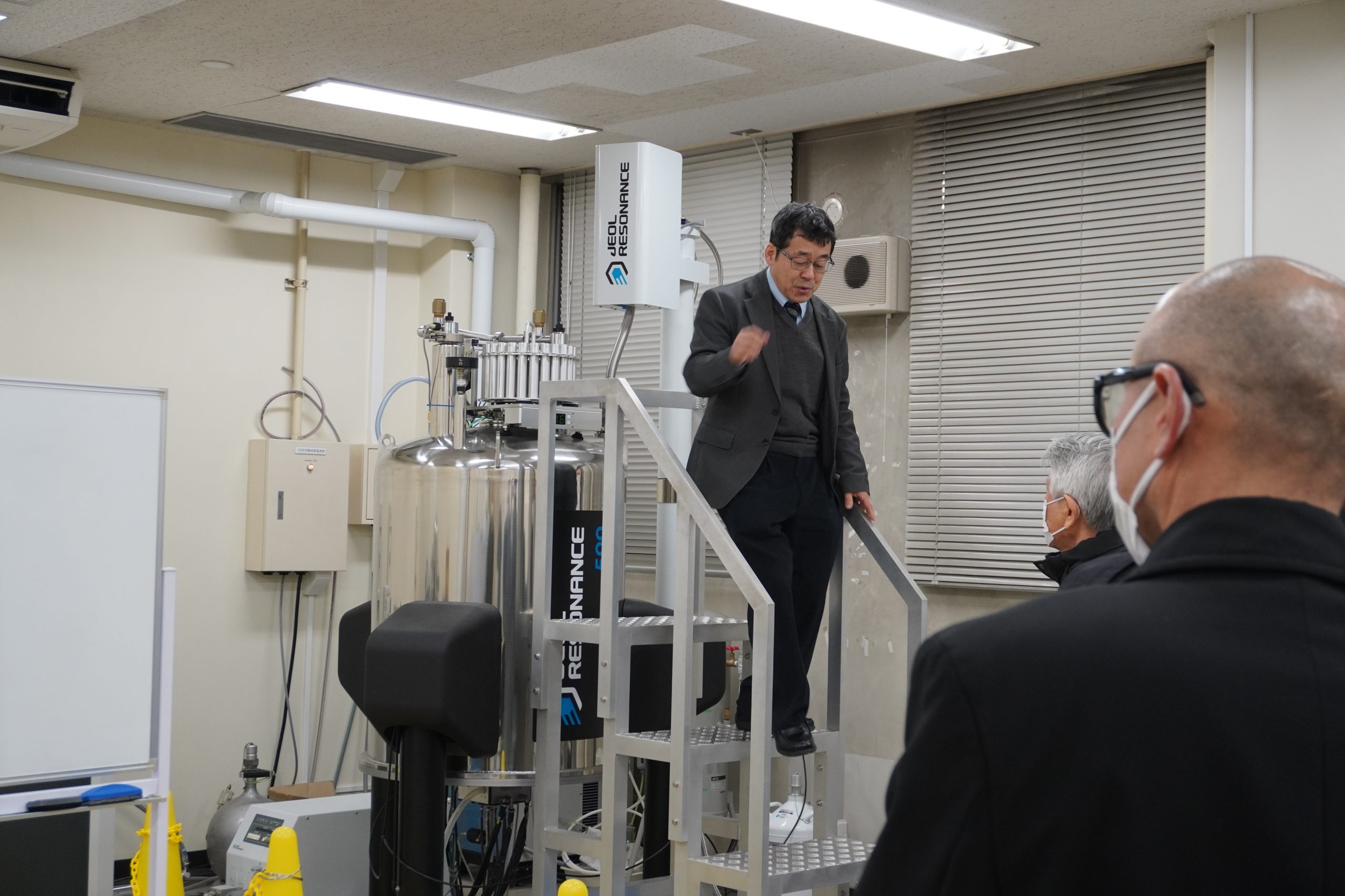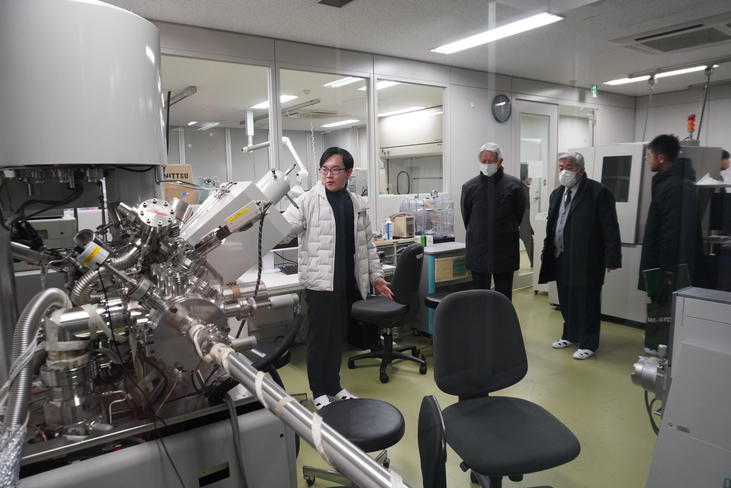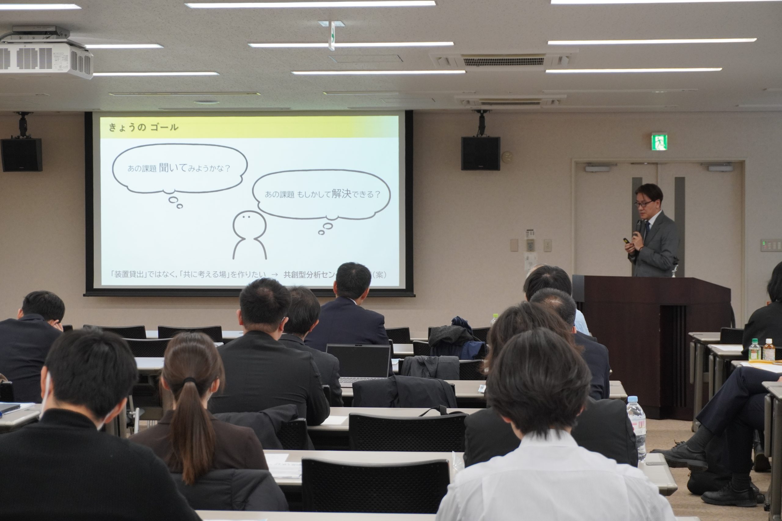 周辺地域の企業との連携促進のための活動の一つとしてCUP-Kが主催し、関東学院大学と横浜企業経営支援財団(IDEC)とで共催、横須賀商工会議所の協力を得て、本学を会場として行われました。CUP-Kは、企業が抱える課題を解決していくことを目的に、複数の大学、公的産学連携支援機関、企業団体が協力して設立され、企業の課題に応じて、最適な研究者、研究成果を紹介する橋渡しを行っています。また、CUP-Kに参画する各大学では、電子顕微鏡や精密分析機器等を共同利用機器として学内外へ公開し、産学連携事業を積極的に推進しています。現在、関東学院大学では分析機器等の公開は行っていませんが、将来的に企業の課題解決のためのリソースを提供するための枠組みを作ることを検討しています。機器分析センター連絡会議では、横浜国立大学 研究推進機構 機器分析評価センターの概要や、東海大学、東京都市大学の施設や分析機器等を利用した産学連携実施状況等が紹介され、本学は、地域企業との今後の共創を見据えて、研究事例や研究室等の紹介・見学ツアーを実施しました。見学ツアーでは、理工学部の学生・院生が学内施設設備を案内して回り、それぞれの研究室で、担当教員とともに研究内容を説明。参加した企業の方々は熱心に説明に耳を傾け、活発に質問を投げかけるなど、強く関心を持った様子が見られました。