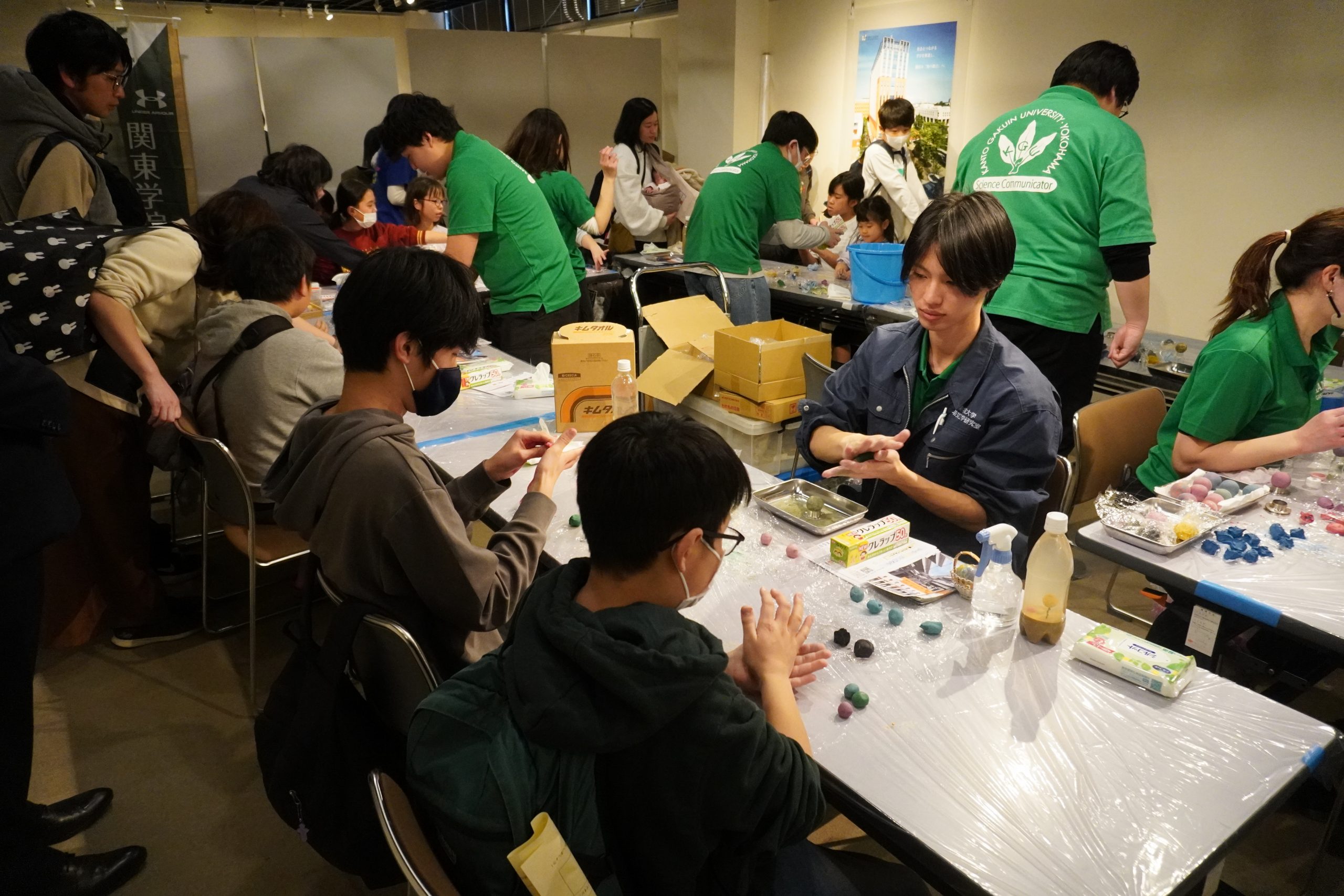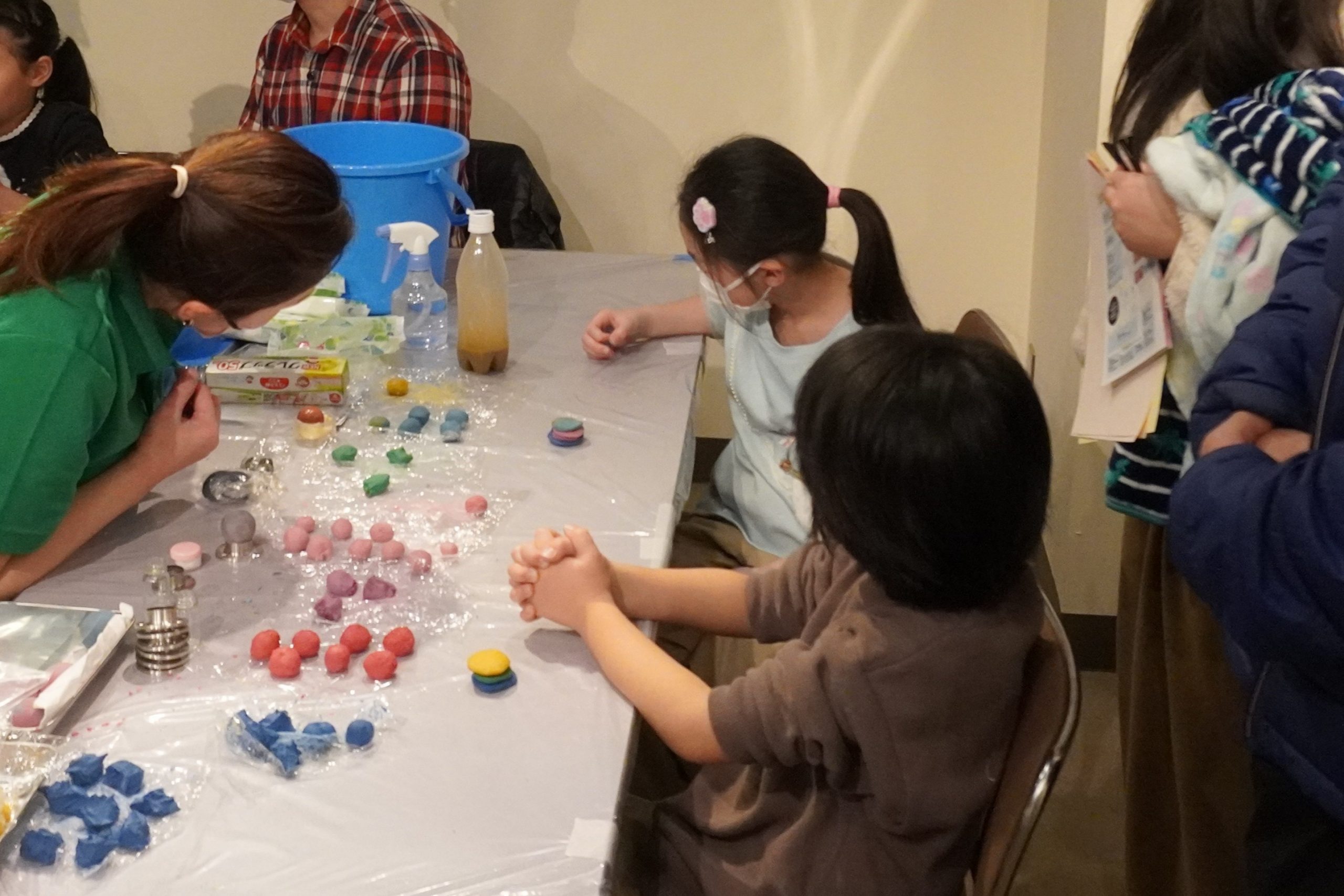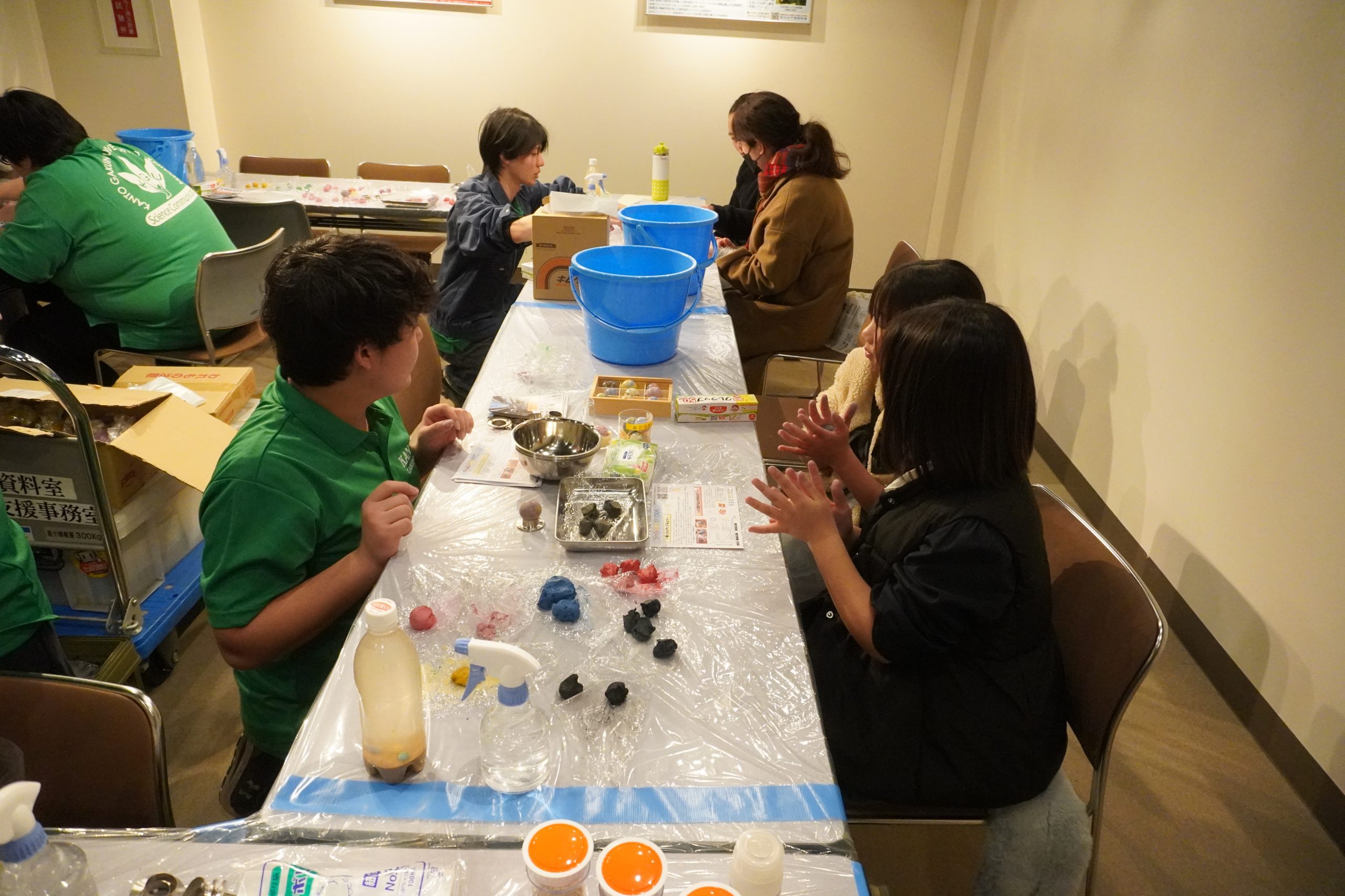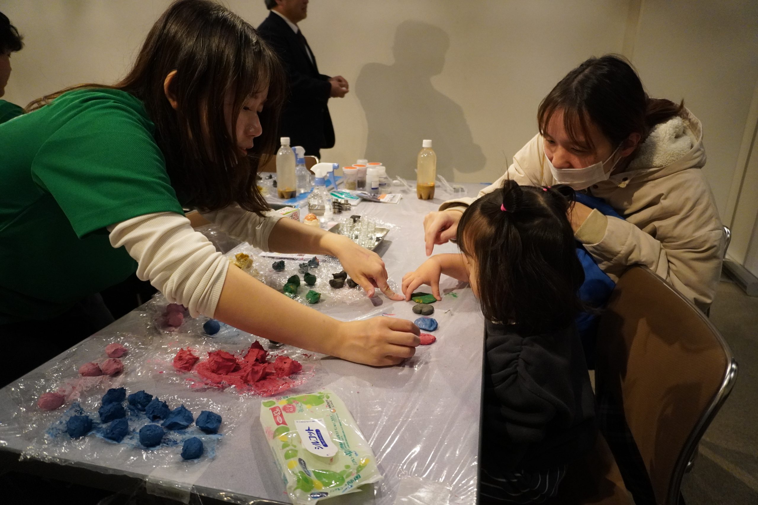 ブースでは、研究内容を紹介するパネル展示を行うとともに、「光るアートどろ団子をつくろう!」と題して、どろ団子づくりを通して土の性質を体験的に学べるワークショップを実施しました。今回のワークショップでは、参加者がカラフルな粘土から好きな4色を選び、のばしたりちぎったりしながら球体に整えるまでの工程を体験。工学研究科の規矩研究室と福谷陽研究室の学生たちがサポートする中、子どもたちは一生懸命に手を動かしながら、粘土の感触や変化を楽しんでいました。そして、持ち帰った後の仕上げとして小瓶で表面を擦ると、土の粒子の向きが揃い、光を反射して輝くどろ団子が完成することを学生たちが実演を交えながら説明すると、熱心に聞き入っていました。