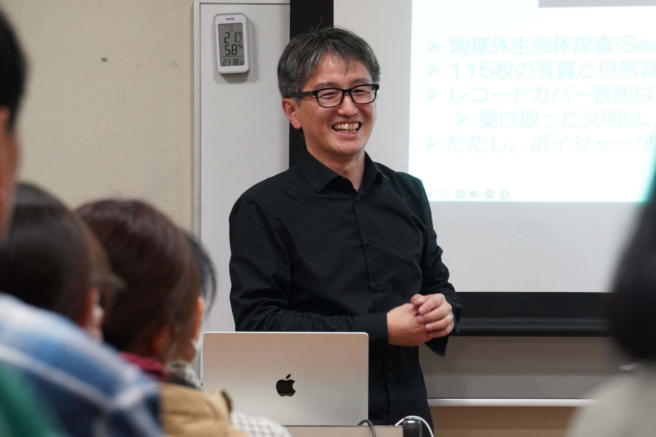 なかでも参加者の関心を惹きつけたのは、”宇宙人はいるのか”という話題です。中嶋教授は、まだ見ぬ知的生命体へ向けた数々のメッセージが刻まれたゴールデンレコードを紹介。このレコードは、およそ50年にわたって宇宙を航行する探査機「ボイジャー1号」に搭載されており、レコードに刻まれた”水素原子の遷移”を表す記号で再生スピードが示されています。水素原子の遷移は、宇宙のどこであっても変わらない物理の法則だといいます。知的生命体も私たち人間の身体と同じように原子で構成されており、その一部には水素が含まれていると考えられます。そのため、知的生命体が水素の性質を理解していれば、レコードが再生でき、応答してくれる可能性があるのです。