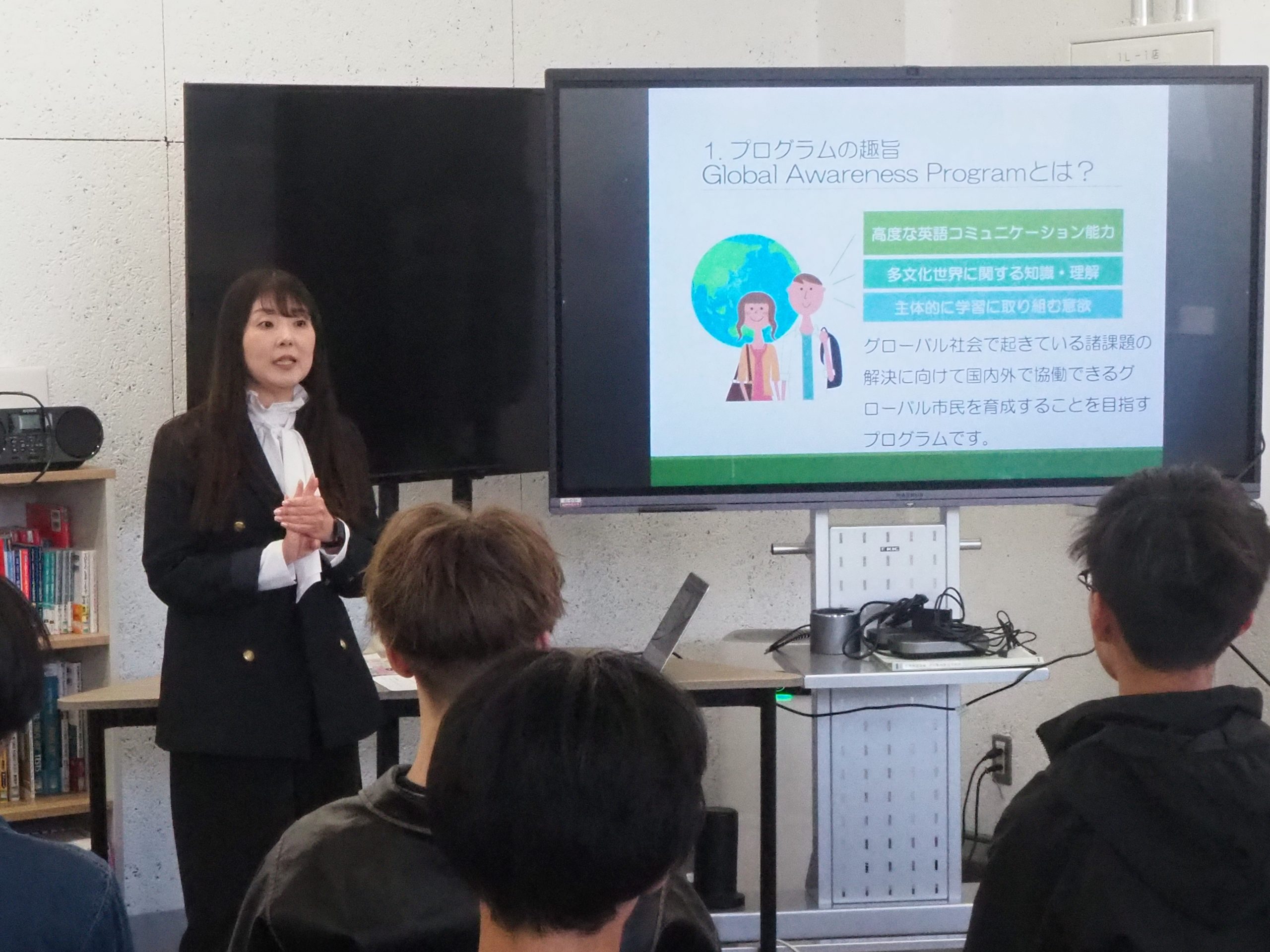 当日は、担当教員からプログラムの趣旨や特色、今後予定されている活動について説明がありました。英語を「学ぶ対象」としてだけでなく、「使って学ぶ手段」として位置づけるCLIL科目や、留学を見据えた学修支援に加え、国際大会でのボランティア、海外大学との交流、海外研修など、教室の外で英語力と主体性を発揮する多様な機会が紹介されました。