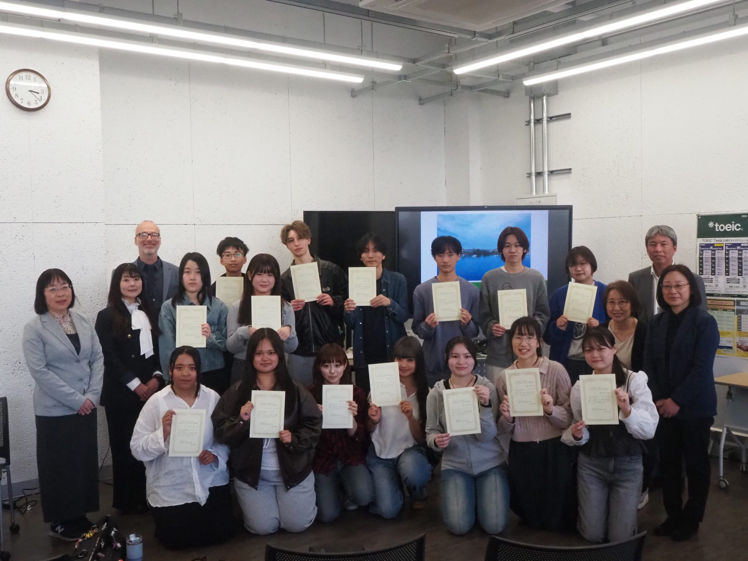 4月3日、横浜・金沢八景キャンパスにおいて、国際文化学部英語文化コースの「GAP(Global Awareness Program)」採用通知授与式が行われました。今年度は15人の新入生がGAP生として採用され、教員から一人ひとりに採用通知書が手渡されました。GAPは、実践的な英語コミュニケーション能力を養い、国内外で活躍できるグローバル市民の育成をめざす、英語文化コースの特別プログラムです。留学奨学金の給付、上位クラスでの英語科目の履修、GAP生向けの演習科目、学内TOEFL ITPの受験支援など、意欲的に学ぶ学生を後押しする多彩な制度が設けられています。今年度でGAPは4期生を迎え、初めて1年生から4年生までGAP生がそろう年度となります。